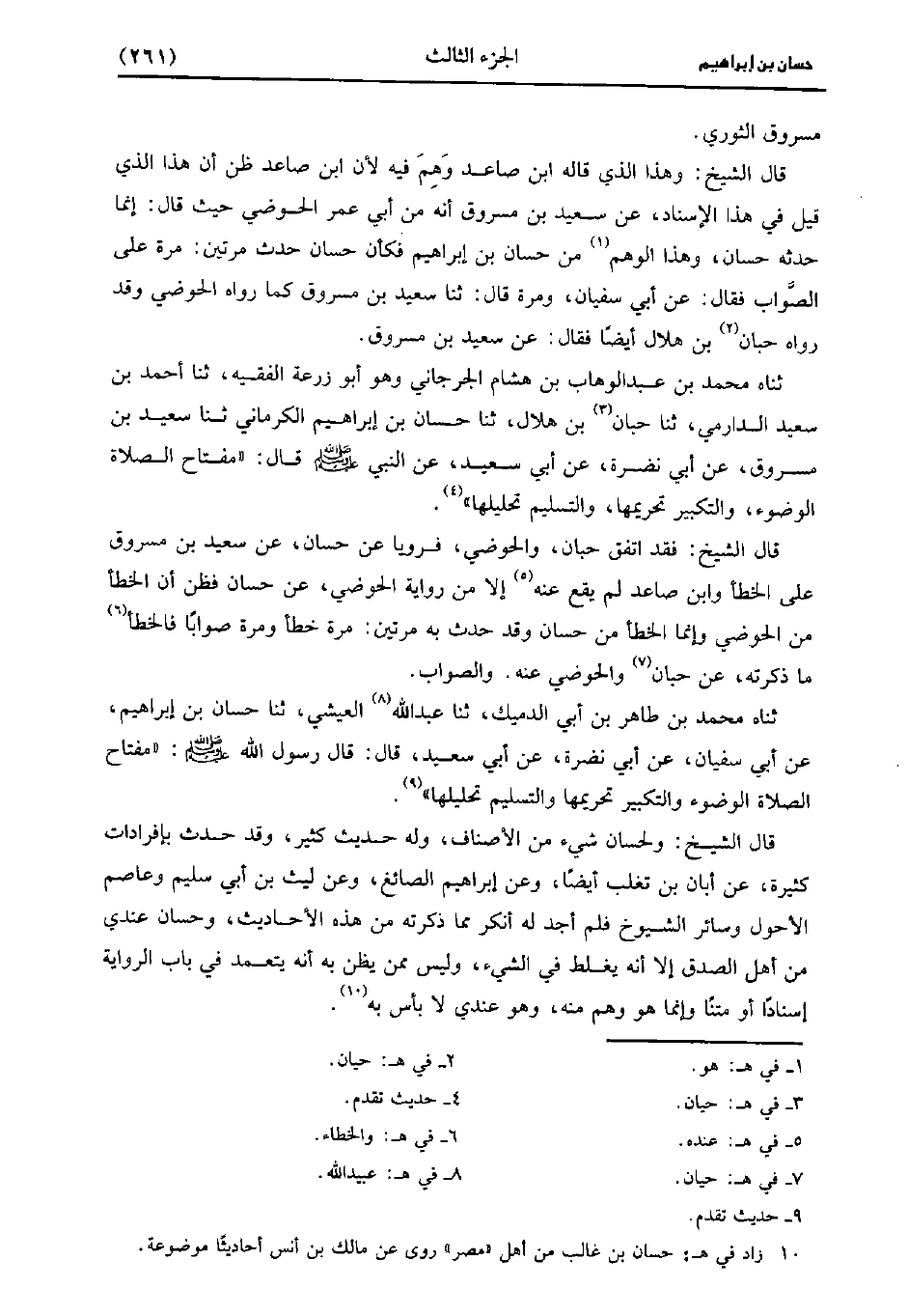 قال الشيخ: فقد اتفق حبان والحوضي فرويا عن حسان عن سَعِيد بن مسروق على الخطأ، وابن صاعد لم يقع عنه إلاَّ من رواية الحوصي عن حسان فظن أن الخطأ من الحوضي وإنما الخطأ من حسان وقد حدث به مرتين مرة خطأ ومرة صوابا فالخطأ ما ذكرته عن حبان والحوضي عنه والصواب.