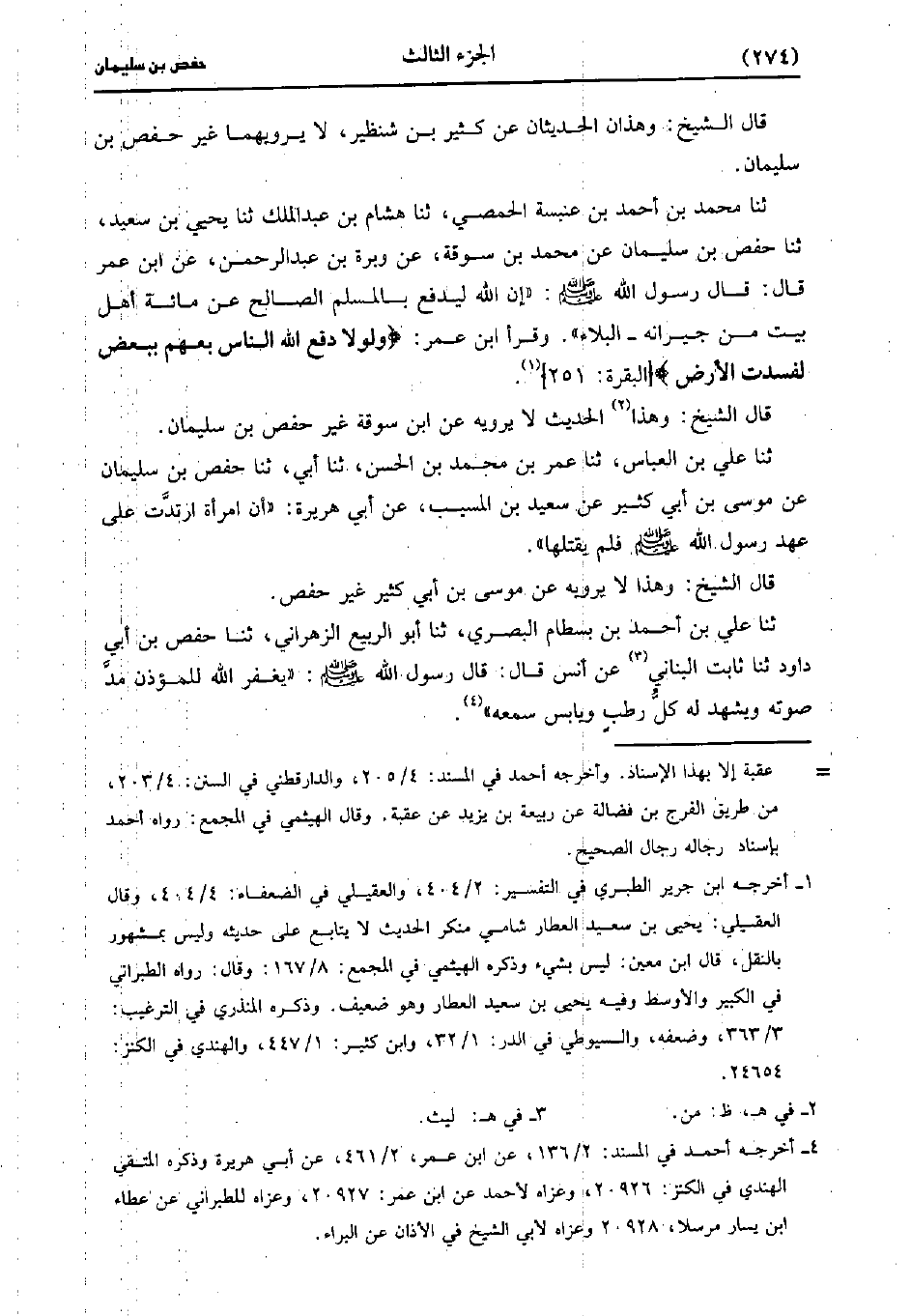 حَدَّثَنَا مُحَمد بْنُ أحمد بن عنبسة الحمصي، حَدَّثَنا هِشَامُ بْنُ عَبد الْمَلِكِ، حَدَّثَنا يَحْيى بن سَعِيد، حَدَّثَنا حَفْصُ بْنُ سُلَيْمَانَ عَنْ مُحَمد بْنِ سُوقَةَ عَنْ وَبَرَةَ بْنِ عَبد الرَّحْمَنِ، عنِ ابْنِ عُمَر، قَال: قَال رَسُولُ اللَّهِ صَلَّى اللَّهُ عَلَيْهِ وَسَلَّمَ إِنَّ اللَّهَ ليدفع بالمسلم الصالح عن مِئَة أَهْلِ بَيْتٍ مِنْ جِيرَانِهِ الْبَلاءَ وقرأ بن عُمَر وَلَوْلا دَفْعُ اللَّهِ النَّاسَ بعضهم ببعض لفسدت الأَرْضِ.