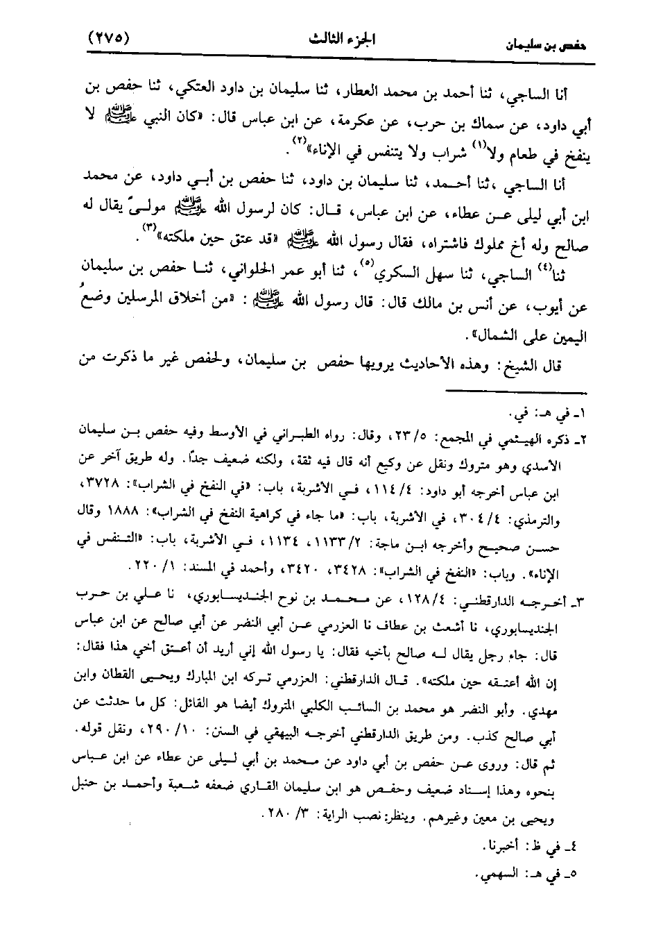أخبرنا السَّاجِيُّ، حَدَّثَنا أَحْمَدُ بْنُ مُحَمد العطار، حَدَّثَنا سليمان بن داود العتكي، حَدَّثَنا حَفْصُ بْنُ أَبِي دَاوُدَ عَنِ سِمَاكِ بْنِ حَرْبٍ، عَنْ عِكرمَة، عنِ ابْنِ عَبَّاسٍ، قَال: كَانَ النَّبِيُّ صَلَّى اللَّهُ عَلَيهِ وَسلَّمَ: لاَ يَنْفُخُ فِي طَعَامٍ، ولاَ شَرَابٍ، ولاَ يَتَنَفَّسُ فِي الإِنَاءِ.