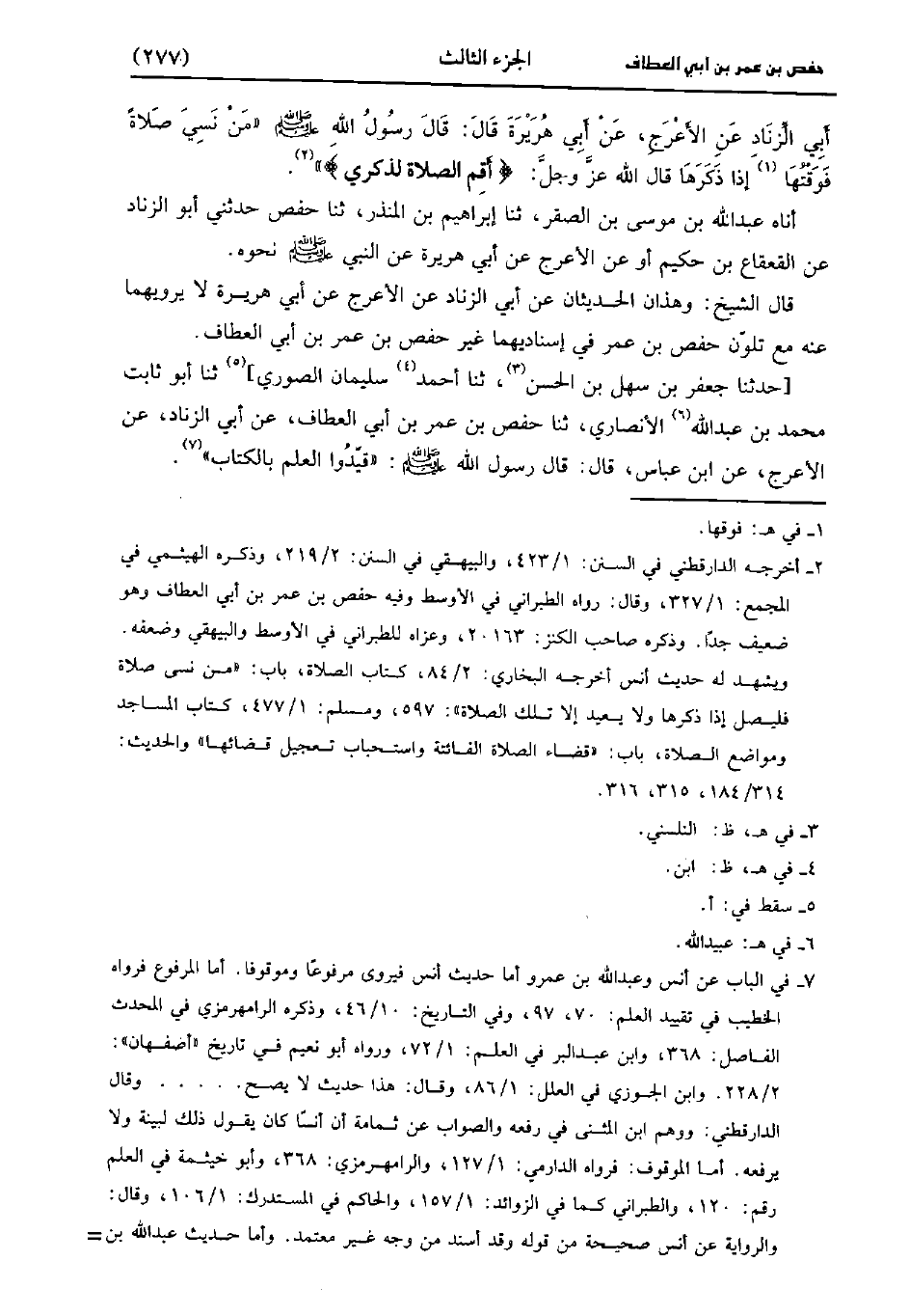 حَدَّثَنَا جَعْفَرُ بْنُ سَهْلِ بْنِ الحسن، حَدَّثَنا أحمد سليمان الصوري، حَدَّثَنا أَبُو ثَابِتٍ مُحَمد بْنُ عَبد الله الأنصاري، حَدَّثَنا حَفْصُ بْنُ عُمَر بْنِ أَبِي الْعَطَّافِ، عَن أَبِي الزِّنَادِ عَنِ الأَعْرَجِ، عنِ ابْنِ عَبَّاسٍ، قَال: قَال رَسُولُ اللَّهِ صَلَّى اللَّهُ عَلَيْهِ وَسَلَّمَ قَيِّدُوا الْعِلْمَ بِالْكِتَابِ