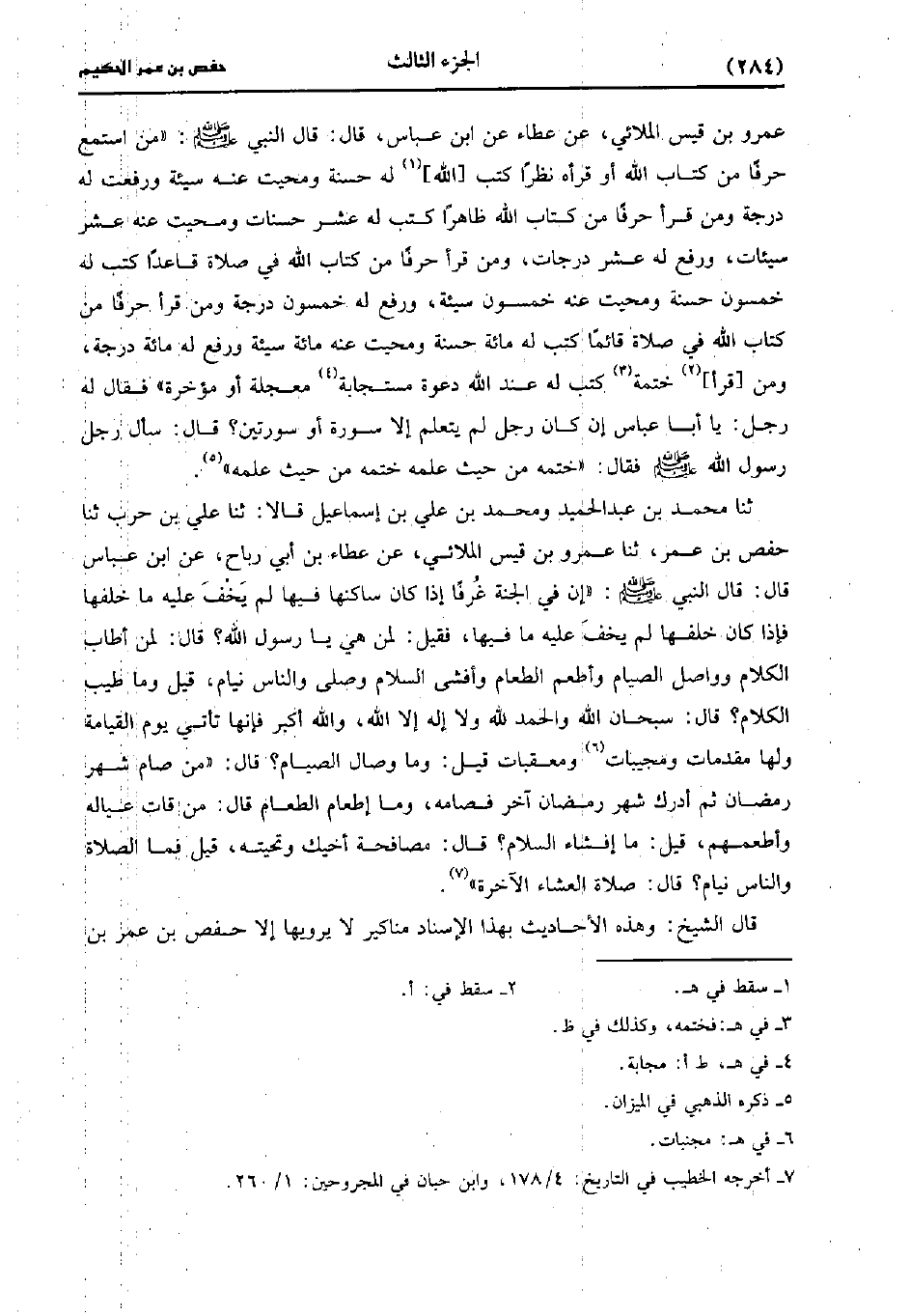 عَمْرو بن قيس الملائي عن عَطَاءٍ، عنِ ابْنِ عَبَّاسٍ، قَال: قَال النَّبِيُّ صَلَّى اللَّهُ عَلَيهِ وَسلَّمَ مَنِ اسْتَمَعَ حَرْفًا مِنْ كِتَابِ اللَّهِ أَوْ قَرَأَهُ نَظَرًا كَتَبَ اللَّهُ لَهُ حَسَنَةً وَمُحِيَتْ عَنْهُ سَيِّئَةٌ وَرُفِعَتْ لَهُ دَرَجَةٌ، ومَنْ قَرَأَ حَرْفًا مِنْ كِتَابِ اللَّهِ ظَاهِرًا كَتَبَ لَهُ عَشَرَ حَسَنَاتٍ وَمُحِيَتْ عَنْهُ عَشَرَ سَيِّئَاتٍ وَرُفِعَ لَهُ عَشْرُ دَرَجَاتٍ، ومَنْ قَرَأَ حَرْفًا مِنْ كِتَابِ اللَّهِ فِي صَلاةٍ قَاعِدًا كُتِبَ لَهُ خَمْسُونَ حَسَنَةً وَمُحِيَتْ عَنْهُ خَمْسُونَ سَيِّئَةً وَرُفِعَ لَهُ خَمْسُونَ دَرَجَةً، ومَنْ قرأحرفا مِنْ كِتَابِ اللَّهِ فِي صَلاةٍ قائما كتب له مِئَة حسنة ومحيت عنه مِئَة سيئة ورفع له مِئَة درجة، ومَنْ قرأ ختمه كُتِبَ لَهُ عِنْدَ اللَّهِ دَعْوَةٌ مُسْتَجَابَةٌ مُعَجَّلَةٌ أَوْ مُؤَخَّرَةٌ فَقَالَ له رجل يا أبا العباس إِنْ كَانَ رَجُلٌ لَمْ يَتَعَلَّمْ إلاَّ سُورَةً أَوْ سُورَتَيْنِ قَالَ سَأَلَ رَجُلٌ رَسُولُ اللَّهِ صَلَّى اللَّهُ عَلَيْهِ وَسَلَّمَ فَقَالَ خَتَمَهُ مِنْ حَيْثُ عَلِمَهُ خَتَمَهُ مِنْ حيث علمه.