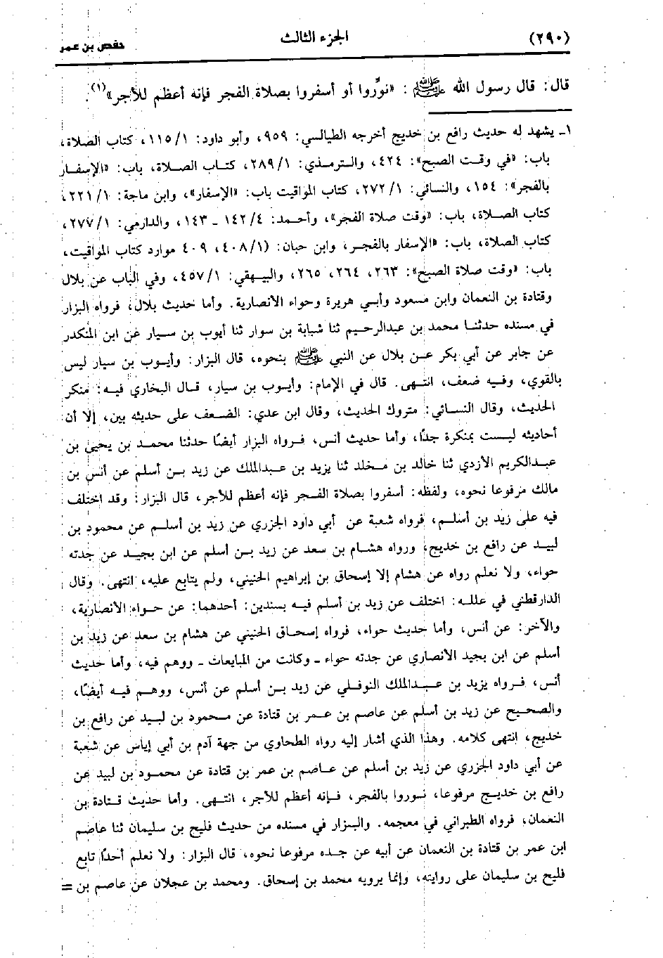 قَالَ قَال رَسُول اللهِ صَلَّى اللَّهُ عَلَيهِ وَسلَّمَ نَوِّرُوا أَوْ أَسْفِرُوا بِصَلاةِ الْفَجْرِ فَإِنَّهُ أَعْظَمَ للأجر