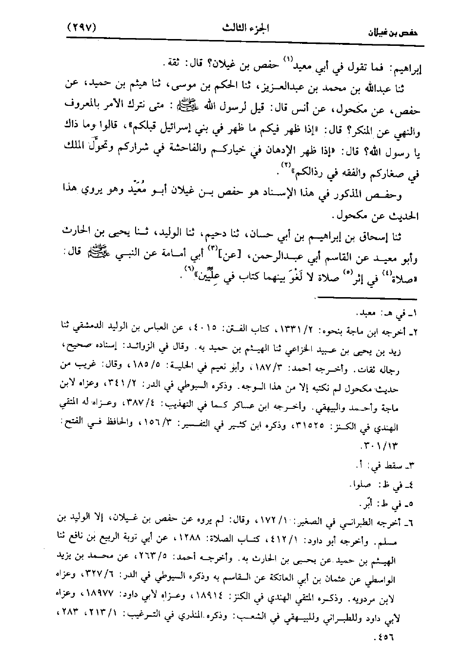 حَدَّثَنَا عَبد اللَّهِ بْنُ مُحَمد بْنِ عَبد الْعَزِيزِ، حَدَّثَنا الحكم بن موسى، حَدَّثَنا هَيْثَمُ بْنُ حُمَيْدٍ عَنْ حَفْصٍ عَنْ مَكْحُولٍ، عَن أَنَس، قَال: قِيل لِرَسُولِ اللَّهِ صَلَّى اللَّهُ عَلَيهِ وَسلَّمَ مَتَى نَتْرُكُ الأَمْرَ بِالْمَعْرُوفِ وَالنَّهْيِ عَنِ الْمُنْكَرِ قَال: إِذَا ظَهَرَ فِيكُمْ مَا ظَهَرَ فِي بَنِي إِسْرَائِيلَ قَبْلَكُمْ قَالُوا وَمَا ذَاكَ يَا رَسُولَ اللهِ قَال: إِذَا ظَهَرَ الإِدِّهَانُ فِي خِيَارِكُمْ وَالْفَاحِشَةُ فِي شِرَارِكُمْ وَتَحَوَّلَ الْمُلْكُ فِي صِغَارِكُمْ وَالْفِقْهُ فِي رُذَالِكُمْ.