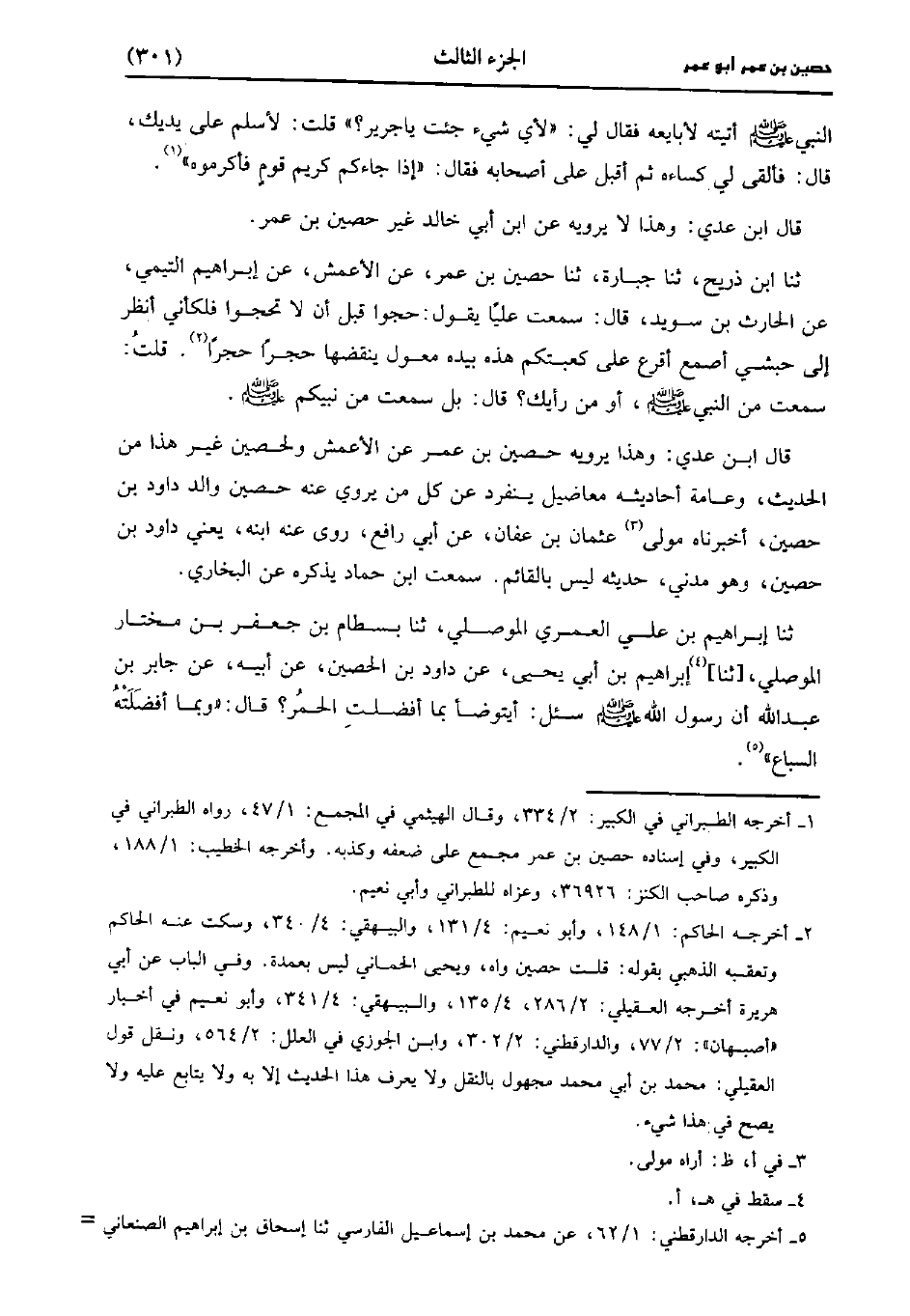 قَالَ ابنُ عَدِي وَهَذَا يَرْوِيهِ حُصَيْنُ بْنُ عُمَر، عَنِ الأَعْمَش وَلِحُصَيْنٍ غَيْرُ هَذَا مِنَ الْحَدِيثِ وَعَامَّةُ أَحَادِيثِهِ مَعَاضِيلُ يَنْفَرِدُ عَنْ كُلِّ مَنْ يَرْوِي عَنْهُ حُصَيْنٌ وَالِدُ دَاوُدَ بْنِ حُصَيْنٍ أَخْبَرَنَاهُ حولي عُثْمَانَ بْنِ عَفَّانَ، عَن أَبِي رَافِعٍ رَوَى عَنْهُ ابْنُهُ يَعْنِي دَاوُدَ بْنَ حُصَيْنٍ، وَهو مَدَنِيٌّ حَدِيثُهُ لَيْسَ بِالْقَائِمِ.