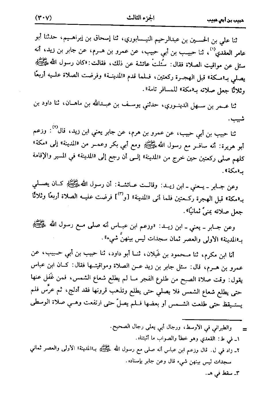 حَدَّثَنَا عَلِيُّ بْنُ الْحُسَيْنِ بْنِ عَبد الرحيم النيسابوري، حَدَّثَنا إِسْحَاقُ بْنُ إِبْرَاهِيمَ، حَدَّثَنا أَبُو عامر العقدي، حَدَّثَنا حَبِيْبِ بْنِ أَبِي حَبِيبٍ عَنْ عَمْرو بن هرم عَنْ جَابِرٍ بْنِ زَيْدٍ أَنَّهُ سُئِلَ عَنْ مَوَاقِيتِ الصَّلاةِ فَقَالَ سُئِلَتْ عَائشة، عَن ذَلِكَ فَقَالَتْ كَانَ رَسُولُ اللَّهِ صَلَّى اللَّهُ عَلَيْهِ وَسَلَّمَ يُصَلِّي بِمَكَّةَ قَبْلَ الْهِجْرَةَ رَكْعَتَيْنِ فَلَمَّا قَدِمَ الْمَدِينَةِ وَفُرِضَتِ الصَّلاةُ عَلَيْهِ أَرْبعًا وَثَلاثًا جَعَلَ صَلاتَهُ بمكة للمسافر تامة.