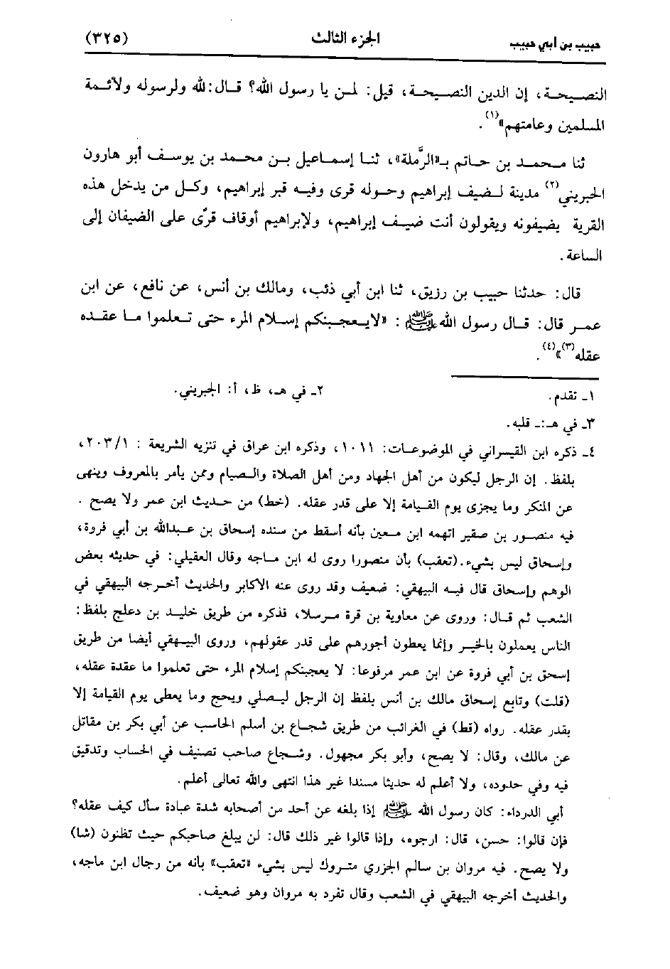 قَالَ، حَدَّثَنا حبيب بن رزيق، حَدَّثَنا ابْنُ أَبِي ذِئْبٍ وَمَالِكُ بْنُ أَنَسٍ عَنْ نَافِعٍ، عنِ ابْنِ عُمَر، قَال: قَال رَسُولُ اللَّهِ صَلَّى اللَّهُ عَلَيْهِ وَسَلَّمَ: لاَ يُعْجِبَنَّكُمْ إِسْلامَ الْمَرْءِ حَتَّى تَعْلَمُوا ما عقده عقله