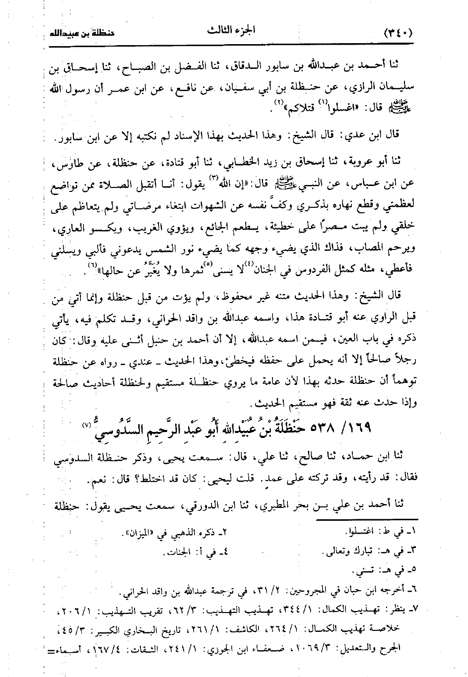 قَالَ الشَّيْخُ: وَهَذَا الْحَدِيثُ مَتْنُهُ غَيْرُ مَحْفُوظٍ وَلَمْ يُؤْتَ مِنْ قِبَلِ حَنْظَلَةَ وَإِنَّمَا أُتِيَ مِنْ قِبَلِ الرَّاوِي عَنْهُ أَبُو قَتَادَةَ هَذَا وَاسْمُهُ عَبد اللَّهِ بْنُ وَاقِدٍ الْحَرَّانِيُّ وَقَدْ تَكَلَّمَ فِيهِ يَأْتِي ذِكْرُهُ فِي بَابِ الْعَيْنِ فِيمَنِ اسْمُهُ عَبد اللَّهِ إلاَّ أَنَّ أَحْمَدَ بْنَ حَنْبَلٍ أَثْنَى عَلَيْهِ وَقَالَ: كَانَ رَجُلا صَالِحًا إلاَّ أنه يحمل على حفظه فيخطىء وَهَذَا الْحَدِيثُ عِنْدِي رَوَاهُ عَنْ حَنْظَلَةَ تَوَهُّمًا أَنَّ حَنْظَلَةَ حَدَّثَهُ بِهَذَا لأَنَّ عَامَّةَ مَا يَرْوِي حَنْظَلَةَ مُسْتَقِيمٌ وَلِحَنْظَلَةَ أَحَادِيثُ صَالِحَةٌ، وَإذا حَدَّثَ عَنْهُ ثِقَةٌ فَهُوَ مستقيم الحديث.