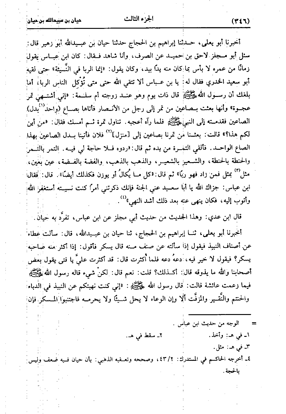 أَخْبَرنا أَبُو يَعْلَى، حَدَّثَنا إِبْرَاهِيمُ بْنُ الْحَجَّاجِ، حَدَّثَنا حَيَّانُ بْنُ عُبَيد اللَّهِ أَبُو زُهَيْرٍ قَالَ سئل أبو مجلز لا حق بن حميد عَنِ الصَّرْفِ وَأَنَا شَاهِدٌ فَقَالَ: كَانَ ابْنُ عَبَّاسٍ يَقُولُ زَمَانًا مِنْ عُمُرِهِ لا بَأْسَ بِمَا كَانَ مِنْهُ يَدًا بِيَدٍ وَكَانَ يَقُولُ إِنَّمَا الرِّبَا فِي النَّسِيئَةِ حَتَّى لَقِيَهُ أَبُو سَعِيد الْخُدْرِيُّ فقال له يا بن عَبَّاسٍ أَلا تَتَّقِي اللَّهَ حَتَّى مَتَى تُؤْكِلُ النَّاسَ الرِّبَا أَمَا بَلَغَكَ أَنَّ رَسُولَ اللَّهِ صَلَّى الله عَلَيْهِ وَسَلَّمَ صَلَّى اللَّهُ عَلَيه وسَلَّم قَال: ذَاتَ يَوْمٍ، وَهو عِنْدَ زَوْجَتِهِ أُمُّ سَلَمَةَ إِنِّي أَشْتَهِي تَمْرَ عَجْوَةٍ وَأَنَّهَا بَعَثَتْ بِصَاعَيْنِ مِنْ تَمْرٍ إِلَى رَجُلٍ مِنَ الأَنْصَارِ فَأَتَاهَا بِصَاعٍ وَاحِدٍ بَدَلَ الصَّاعَيْنِ فَقَدَّمَتْهُ إِلَى النَّبِيِّ صَلَّى اللَّهُ عَلَيهِ وَسلَّمَ فَلَمَّا رَآهُ أَعْجَبَهُ تَنَاوَلَ تَمْرَةً ثُمَّ أَمْسَكَ فَقَالَ مِنْ أَيْنَ لَكُمْ هَذَا قَالَتْ بَعَثْنَا مِنْ تَمْرِنَا بِصَاعَيْنِ إِلَى مَنْزِلِ فُلانٍ فَأَتَيْنَا بَدَلَ الصَّاعَيْنِ بِهَذَا الصَّاعِ الْوَاحِدِ فَأَلْقَى التَّمْرَةَ مِنْ يَدِهِ ثُمَّ قَالَ رُدُّوهُ فَلا حَاجَةَ لِي فِيهِ التَّمْرُ بِالتَّمْرِ وَالْحِنْطَةُ بِالْحِنْطَةِ وَالشَّعِيْرُ بِالشَّعِيرِ وَالذَّهَبُ بِالذَّهَبِ وَالْفِضَّةُ بِالْفِضَّةِ عَيْنٌ بِعَيْنٍ مِثْلٌ بِمِثْلٍ فَمَنْ زَادَ فَهُوَ رِبًا ثُمَّ قَالَ كُلُّ مَا يُكَالُ أَوْ يُوزَنُ فَكَذَلِكَ أَيضًا، قَال: فَقال ابْنُ عَبَّاسٍ جَزَاكَ اللَّهُ يَا أَبَا سَعِيد عَنِّي الْجَنَّةَ فَإِنَّكَ ذَكَّرْتَنِي أَمْرًا كُنْتُ نَسِيتُهُ اسْتَغْفِرُ اللَّهُ وَأَتُوبُ إِلَيْهِ فَكَانَ يَنْهَى عَنْهُ بَعْدَ ذَلِكَ أَشَدَّ النَّهْيِ.