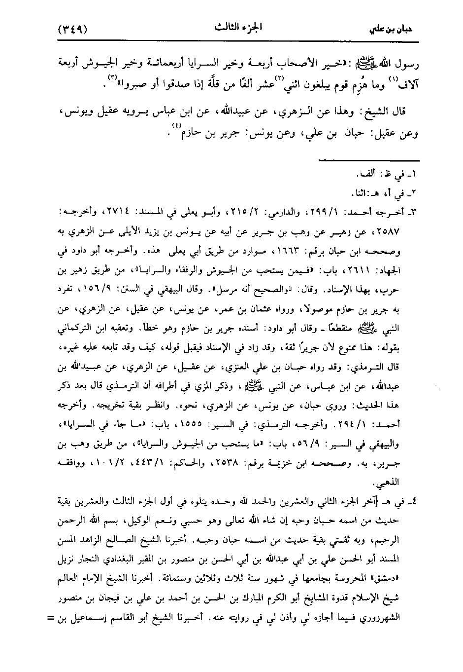 رَسُولِ اللَّهِ صَلَّى اللَّهُ عَلَيهِ وَسلَّمَ خَيْرُ الأَصْحَابِ أَرْبَعَةٌ وَخَيْرُ السرايا أربع مِئَة وَخَيْرُ الْجُيُوشِ أَرْبَعَةُ آلافٍ وَمَا هُزِمَ قَوْمٌ يَبْلُغُونَ اثْنَيْ عَشَرَ أَلْفًا مِنْ قِلَّةٍ إِذَا صَدَقُوا أَوْ صَبَرُوا.