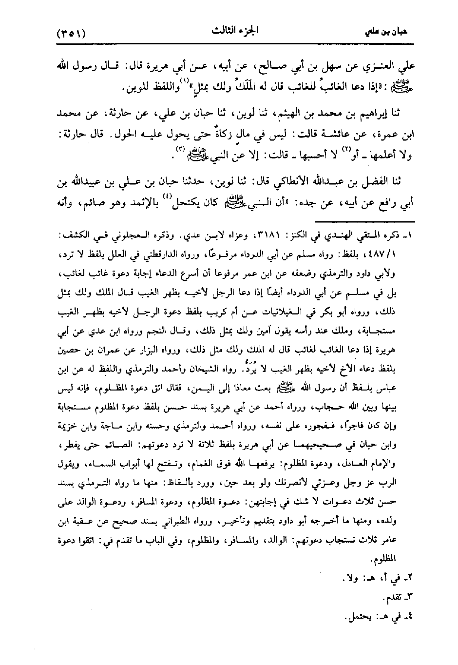علي العنزي، عَنْ سُهَيل بْنِ أَبِي صَالِحٍ، عَنْ أَبِيهِ، عَن أَبِي هُرَيْرَةَ، قَال: قَال رَسُولُ اللَّهِ صَلَّى اللَّهُ عَلَيْهِ وَسَلَّمَ إِذَا دَعَا الْغَائِبُ لِلْغَائِبِ قَالَ لَهُ الْمَلَكُ ولك بمثل واللفظ للوين.