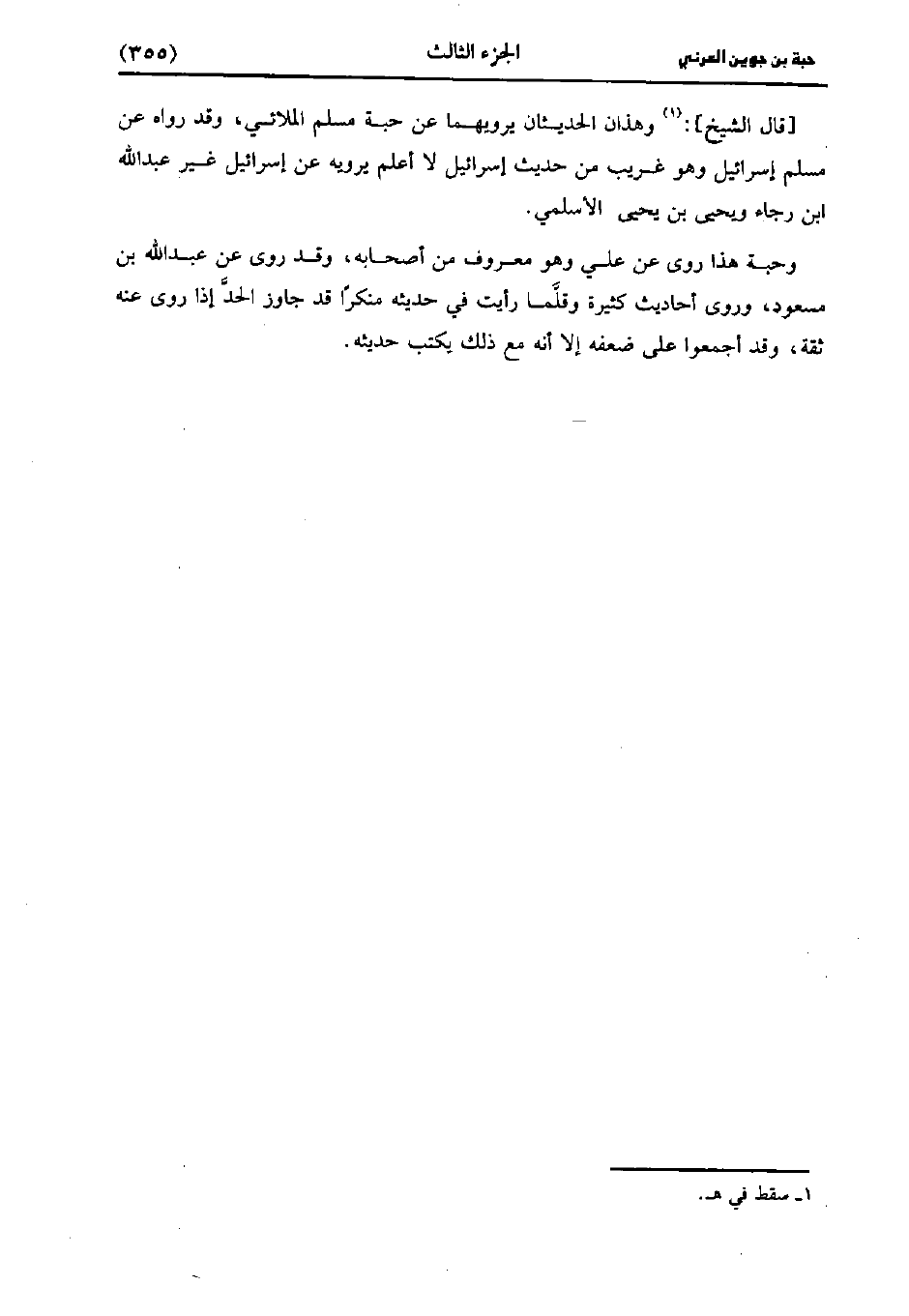 قَالَ الشَّيْخُ: وَهَذَانِ الْحَدِيثَانِ يَرْوِيهِمَا عَنْ حَبَّةَ مُسْلِمٌ الْمُلائِيُّ وَقَدْ رَوَاهُ عَنْ مُسْلِمٍ إِسْرَائِيلُ، وَهو غَرِيبٌ مِنْ حَدِيثِ إِسْرَائِيلَ لا أَعْلَمُ يَرْوِيهِ عَنْ إِسْرَائِيلَ غَيْرُ عَبد اللَّهِ بْنِ رَجَاءٍ وَيَحْيَى بْنُ يَحْيى الأَسْلَمِيُّ.
