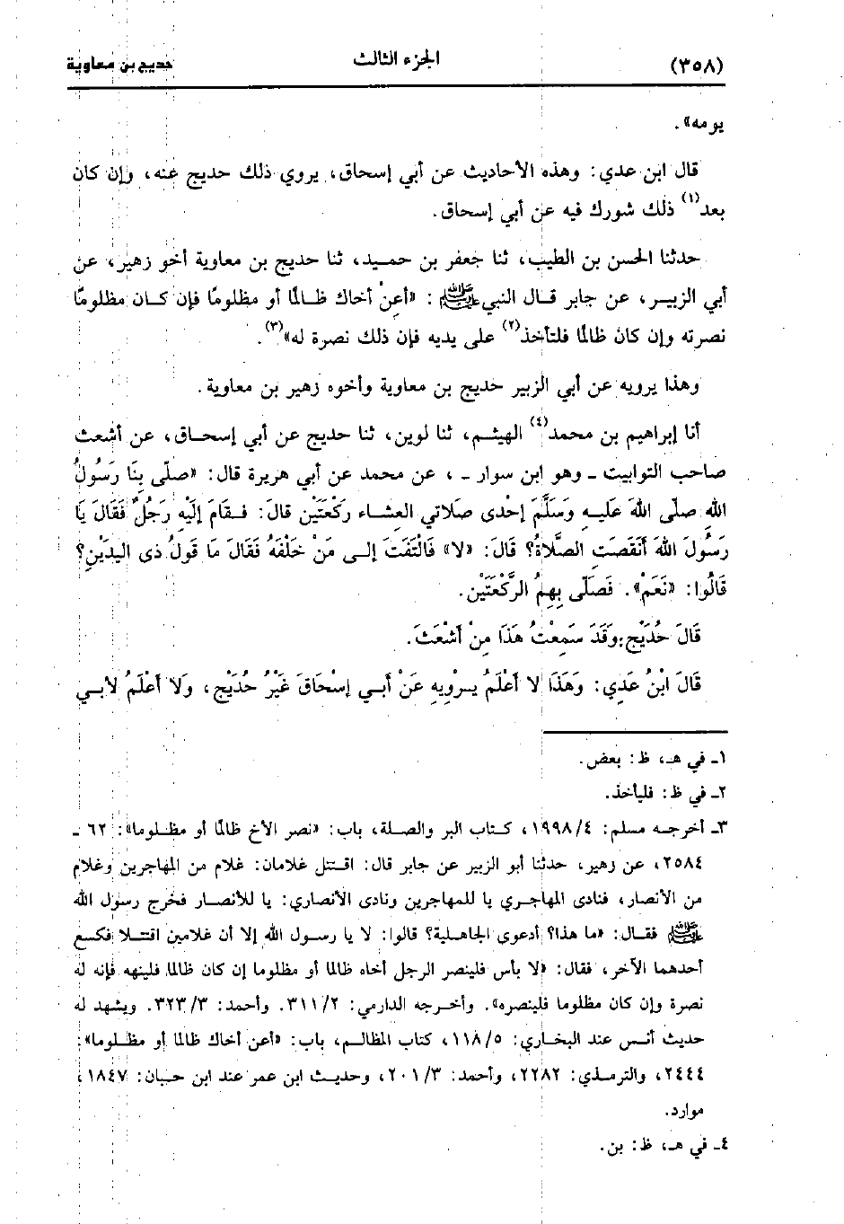 حَدَّثَنَا الْحَسَنُ بْنُ الطيب، حَدَّثَنا جعفر بن حميد، حَدَّثَنا حُدَيْجُ بْنُ مُعَاوِيَةَ أَخُو زُهَيْرٍ، عَن أَبِي الزُّبَيْرِ عَنْ جَابِرٍ قَالَ النَّبِيُّ صَلَّى اللَّهُ عَلَيهِ وَسلَّمَ أَعِنْ أَخَاكَ ظَالِمًا أَوْ مَظْلُومًا فَإِنْ كَانَ مَظْلُومًا نَصَرْتُهُ وَإِنْ كَانَ ظَالِمًا فَلْتَأْخُذْ عَلَى يَدَيْهِ فَإِنَّ ذَلِكَ نُصْرَةً لَهُ.