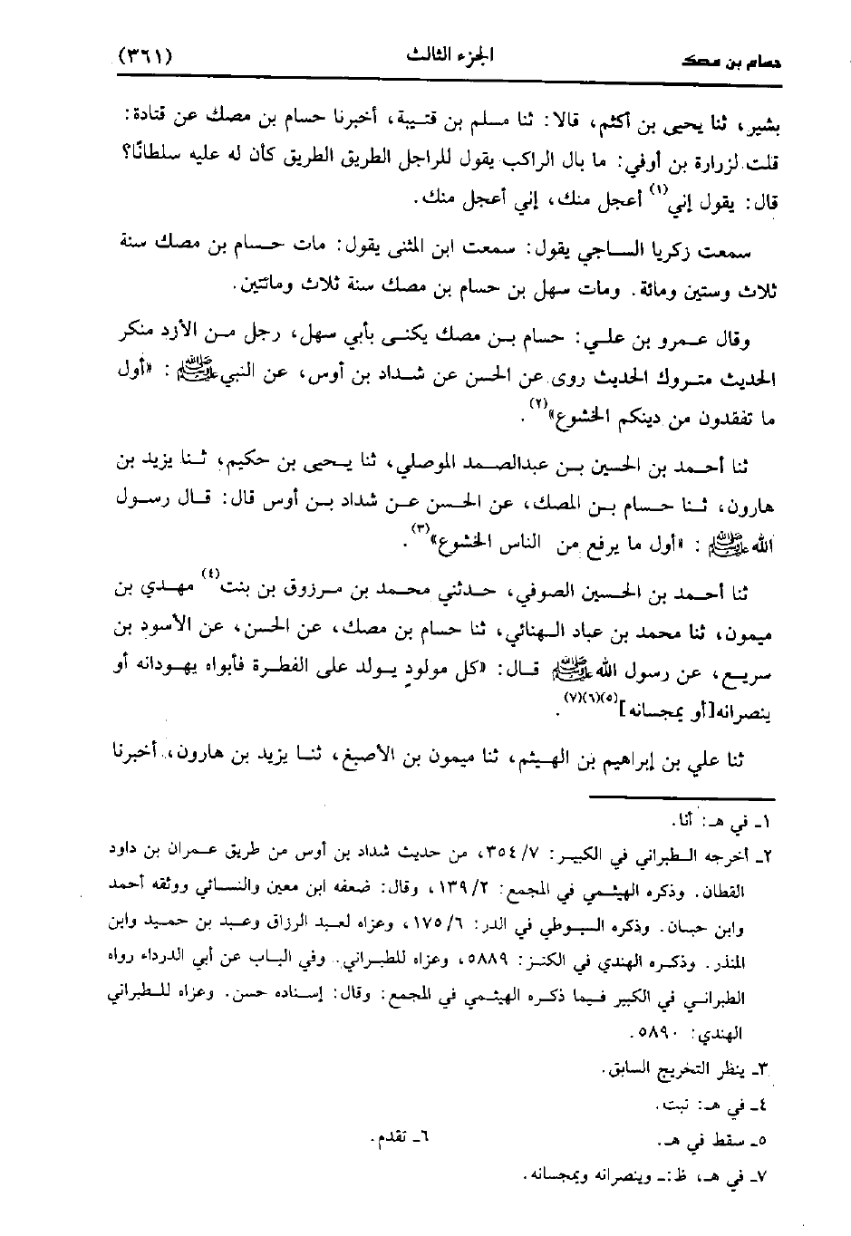 حَدَّثَنَا أَحْمَدُ بْنُ الْحُسَيْنِ الصُّوفيّ، حَدَّثني مُحَمد بن مرزوق بن بنت مهدي بن ميمون، حَدَّثَنا مُحَمد بن عباد الهنائي، حَدَّثَنا حَسَّانُ بْنُ مِصَكٍّ عَنِ الْحَسَنِ، عَن الأَسْوَدِ بْنِ سَرِيعٍ عَنِ رَسُولِ اللَّهِ صَلَّى اللَّهُ عَلَيْهِ وَسَلَّمَ صَلَّى اللَّهُ عَلَيه وسَلَّم قَال: كُلُّ مَوْلُودٍ يُولَدُ عَلَى الْفِطْرَةِ فَأَبَوَاهُ يُهَوِّدَانِهِ أَوْ يُنَصِّرَانِهِ أَوْ يمجسانه.