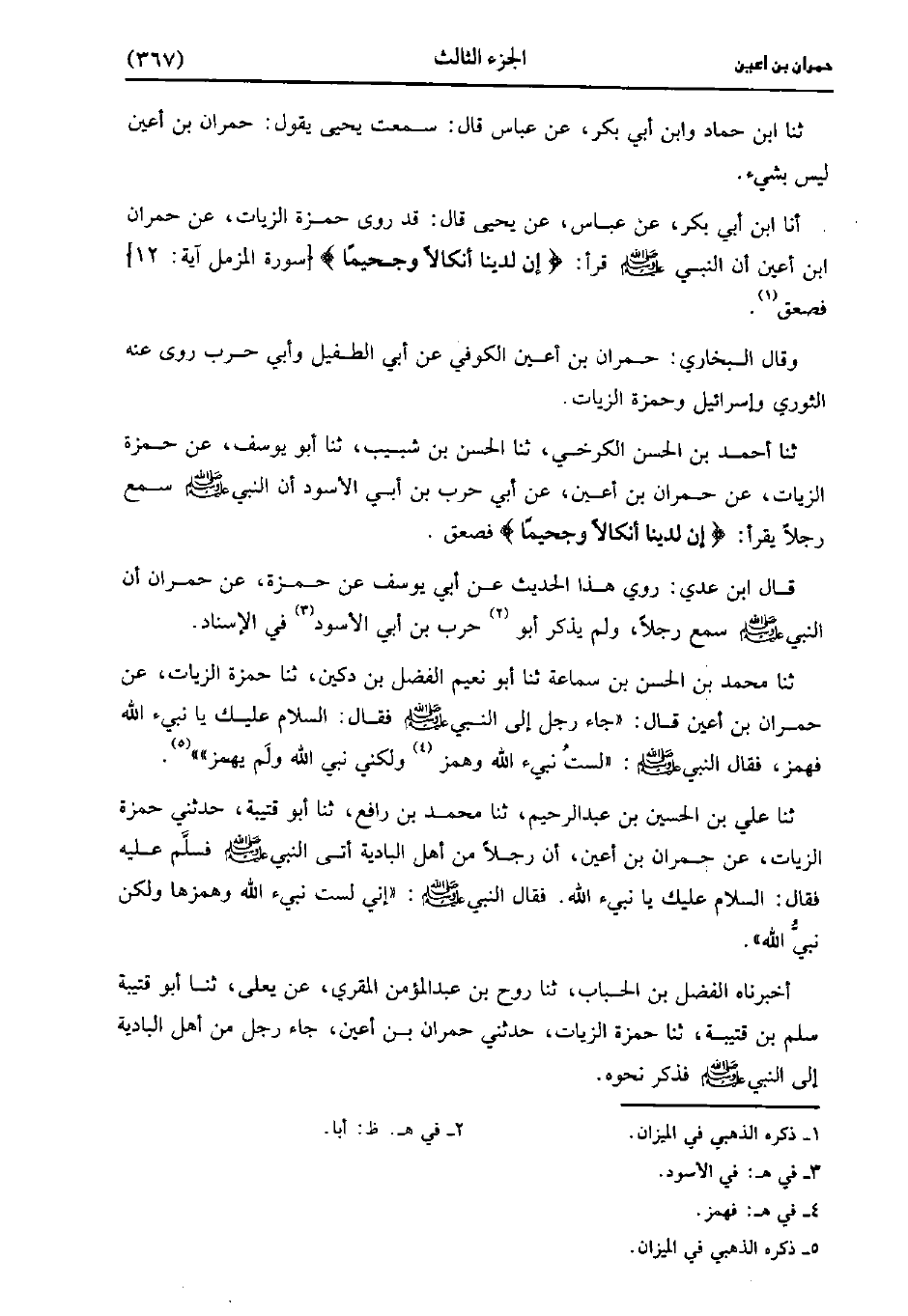 حَدَّثَنَا مُحَمد بْنُ الْحَسَنِ بْنِ سماعه، حَدَّثَنا أَبُو نُعَيْمٍ الْفَضْلُ بْنُ دُكَيْنٍ، حَدَّثَنا حَمْزَةُ الزَّيَّاتُ عَنْ حُمْرَانُ بْنُ أَعْيَنَ قَالَ: جَاء رَجُلٌ إِلَى النَّبِيُّ صَلَّى اللَّهُ عَلَيهِ وَسلَّمَ فقال السلام عليك يا نبي اللَّهِ فَهَمَزَ فَقَالَ النَّبِيُّ صَلَّى اللَّهُ عَلَيهِ وَسلَّمَ لَسْتُ نَبِيءَ اللَّهِ وَهَمَزَ وَلَكِنِّي نَبِيُّ اللَّهِ ولم يهمز.