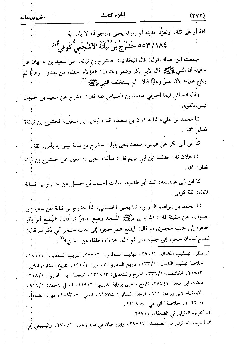 حَدَّثَنَا مُحَمد بْن إِبْرَاهِيم السراج، حَدَّثَنا يَحْيى الحماني، حَدَّثَنا حَشْرَجُ بْنُ نُبَاتَةَ عَنْ سَعِيد بْنِ جُمْهان عَنْ سَفِينَةَ قَال: لَمَّا بَنَى صَلَّى اللَّهُ عَلَيهِ وَسلَّمَ الْمَسْجِدَ وَضَعَ حَجَرًا ثُمَّ قَالَ لِيَضَعْ أَبُو بَكْرٍ حَجَرَهُ إِلَى جَنْبِ حَجَرِي ثُمَّ قَالَ لِيَضَعْ عُمَر حَجَرَهُ إِلَى جَنْبِ حَجَرِ أَبِي بَكْرٍ ثُمَّ قَالَ لِيَضَعَ عُثْمَانُ حَجَرَهُ إِلَى جَنْبِ عُمَر ثُمَّ قَالَ هَؤُلاءِ الْخُلَفَاءُ من بعدي