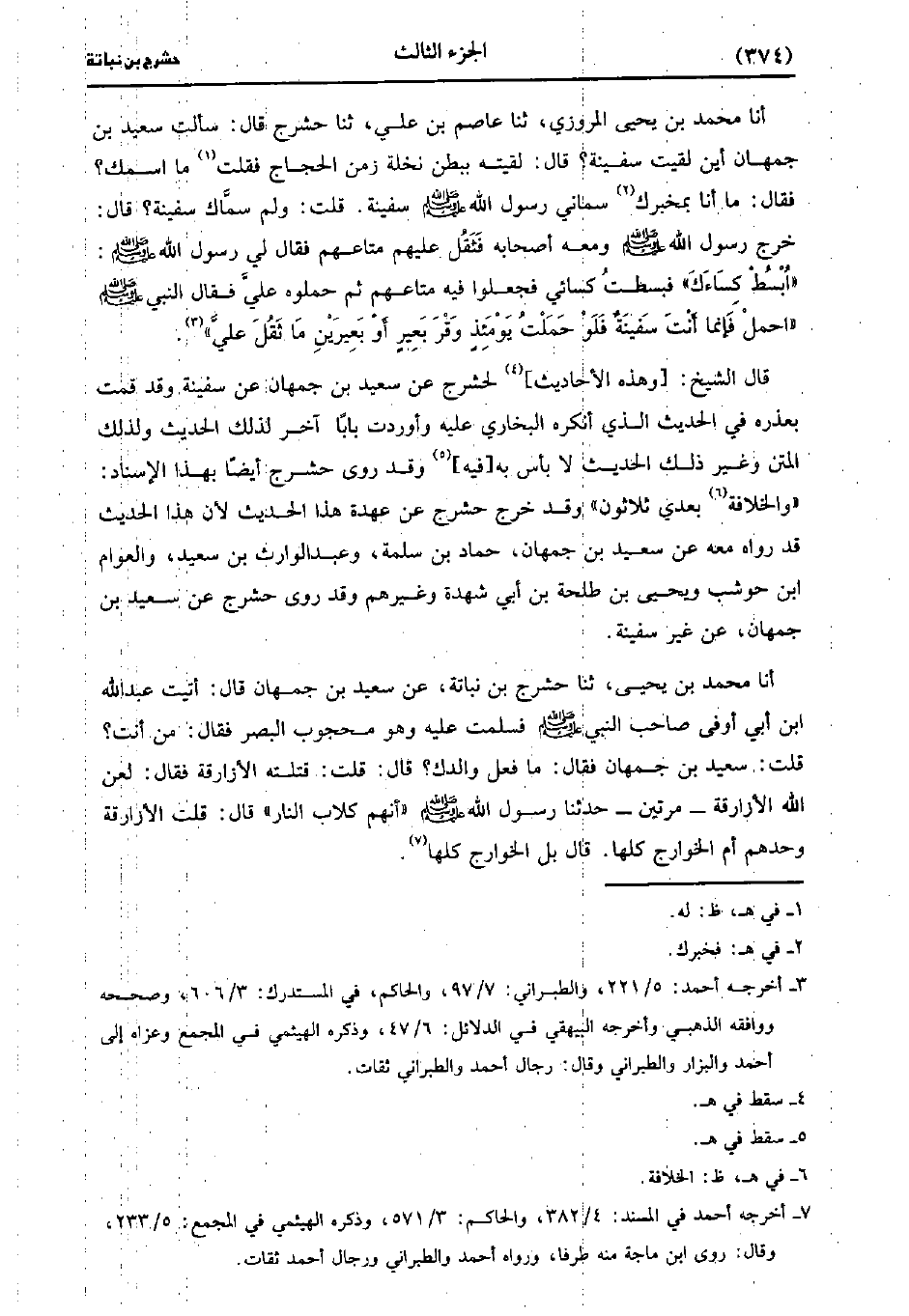 قَالَ الشَّيْخُ: وَهَذِهِ الأَحَادِيثُ لِحَشْرَجٍ عَنْ سَعِيد بْنِ جُمْهان عَنْ سَفِينَةَ وَقَدْ قُمْتُ بِعُذْرِهِ فِي الْحَدِيثِ الَّذِي أَنْكَرَهُ البُخارِيّ عَلَيْهِ وَأَوْرَدْتُ بَابًا آخَرَ لِذَلِكَ الْحَدِيثِ وَلِذَلِكَ الْمَتْنِ وَغَيْرُ ذَلِكَ الْحَدِيثُ لا بَأْسَ بِهِ فِيهِ وَقَدْ رَوَى حَشْرَجٌ أَيضًا بِهَذَا الإِسْنَادِ وَالْخِلافَةُ بَعْدِي ثَلاثُونَ وَقَدْ خَرَجَ حَشْرَجٌ عَنْ عُهْدَةِ هَذَا الْحَدِيثِ لأَنَّ هَذَا الْحَدِيثَ قَدْ رَوَاهُ مَعَهُ عَنْ سَعِيد بْنِ جُمْهان حَمَّادُ بْنُ سَلَمَةَ، وَعَبد الْوَارِثِ بْنُ سَعِيد وَالْعَوَّامُ بْنُ حَوْشَبٍ وَيَحْيَى بْنُ طَلْحَةَ بْنِ أَبِي شُهْدَةَ وَغَيْرِهِمْ وَقَدْ رَوَى حَشْرَجٌ عَنْ سَعِيد بْنِ جُمْهان عَنْ غَيْرِ سَفِينَةَ.