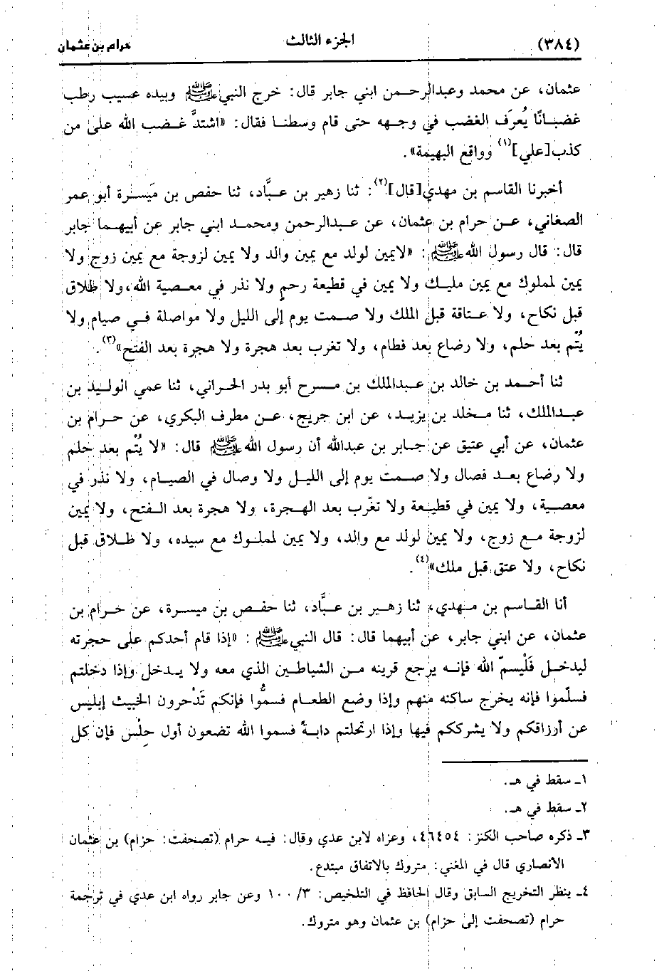 حَدَّثَنَا الْقَاسِمُ بْنُ مَهْدِيٍّ، قَال: حَدَّثَنا زهير بن عباد، حَدَّثَنا حَفْصُ بْنُ مَيْسَرَةَ أَبُو عُمَر الصَّغَانِيُّ عَنْ حَرَامِ بْنِ عُثْمَانَ عن عَبد الرحمن، وَمُحمد بني جابر عَنْ أَبِيهِمَا جَابِرٍ، قَال: قَال رَسُولُ اللَّهِ صَلَّى اللَّهُ عَلَيْهِ وَسَلَّمَ: لاَ يَمِينَ لِوَلَدٍ مَعَ يَمِينِ وَالِدٍ، ولاَ يَمِينَ لِزَوْجَةٍ مَعَ يَمِينِ زَوْجٍ، ولاَ يَمِينَ لِمَمْلُوكٍ مَعَ يَمِينِ مَلِيكٍ، ولاَ يَمِينَ فِي قَطِيعَةِ رَحِمٍ، ولاَ نَذْرَ فِي مَعْصَيَةِ اللَّهِ، ولاَ طَلاقَ قَبْلَ نِكَاحٍ، ولاَ عِتَاقَةَ قَبْلَ الْمِلْكِ، ولاَ صَمْتَ يَوْمٍ إِلَى اللَّيْلِ، ولاَ مُوَاصَلَةَ فِي صِيَامٍ، ولاَ يُتْمَ بَعْدَ حُلُمٍ، ولاَ رِضَاعَ بَعْدَ فِطَامٍ، ولاَ تَغَرُّبَ بَعْدَ هِجْرَةٍ، ولاَ هجرة بعد الفتح.