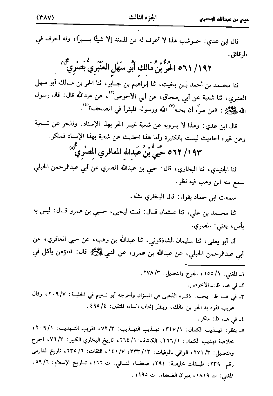 قَالَ ابنُ عَدِي وهذا لا يرويه عن شُعْبَة غير الحر بهذا الإسناد وللحر عن شُعْبَة وعن غيره أحاديث ليست بالكثيرة وأما هذا الحديث عن شُعْبَة بهذا الإسناد فمنكر.