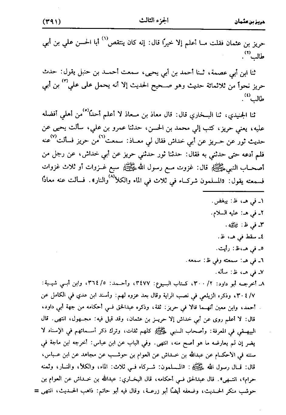 حَدَّثَنَا الجنيدي، حَدَّثَنا البُخارِيّ، قَال: قَال مُعَاذُ بْنُ مُعَاذٍ لا أَعْلَمُ أَحَدًا مِنْ أَهْلِي أُفَضِّلُهُ عَلَيْهِ يَعْنِي حَرِيزَ كَتَبَ إِلَيَّ مُحَمد بْنُ الْحَسَنِ، حَدَّثَنا عَمْرو بْنُ عَلِيٍّ سَأَلْتُ يَحْيى عَنْ حَدِيثِ ثَوْرٍ عَنْ حَرِيزٍ، عَن أَبِي خِدَاشٍ فَقَالَ لِي مُعَاذٌ سَمِعْتُ مِنْ حَرِيزٍ فَسَأَلْتُ عَنْهُ فَلَمْ أَدَعْهُ حَتَّى، حَدَّثني بِهِ فَقَالَ، حَدَّثَنا ثَوْرٌ، حَدَّثني حَرِيزٌ، عَن أَبِي خِدَاشٍ عَنْ رَجُلٍ مِنْ أَصْحَابِ النَّبِيِّ صَلَّى اللَّهُ عَلَيه وسَلَّم قَال: غَزَوْتُ مَعَ رَسُولِ اللَّهِ صَلَّى اللَّهُ عَلَيْهِ وَسَلَّمَ سَبْعَ غَزَوَاتٍ أَوْ ثَلاثِ غَزَوَاتٍ فَسَمِعْتُهُ يَقُولُ الْمُسْلِمُونَ شُرَكَاءُ فِي ثَلاثٍ فِي الْمَاءِ وَالْكَلأِ والنار فسألت عنه معاذا