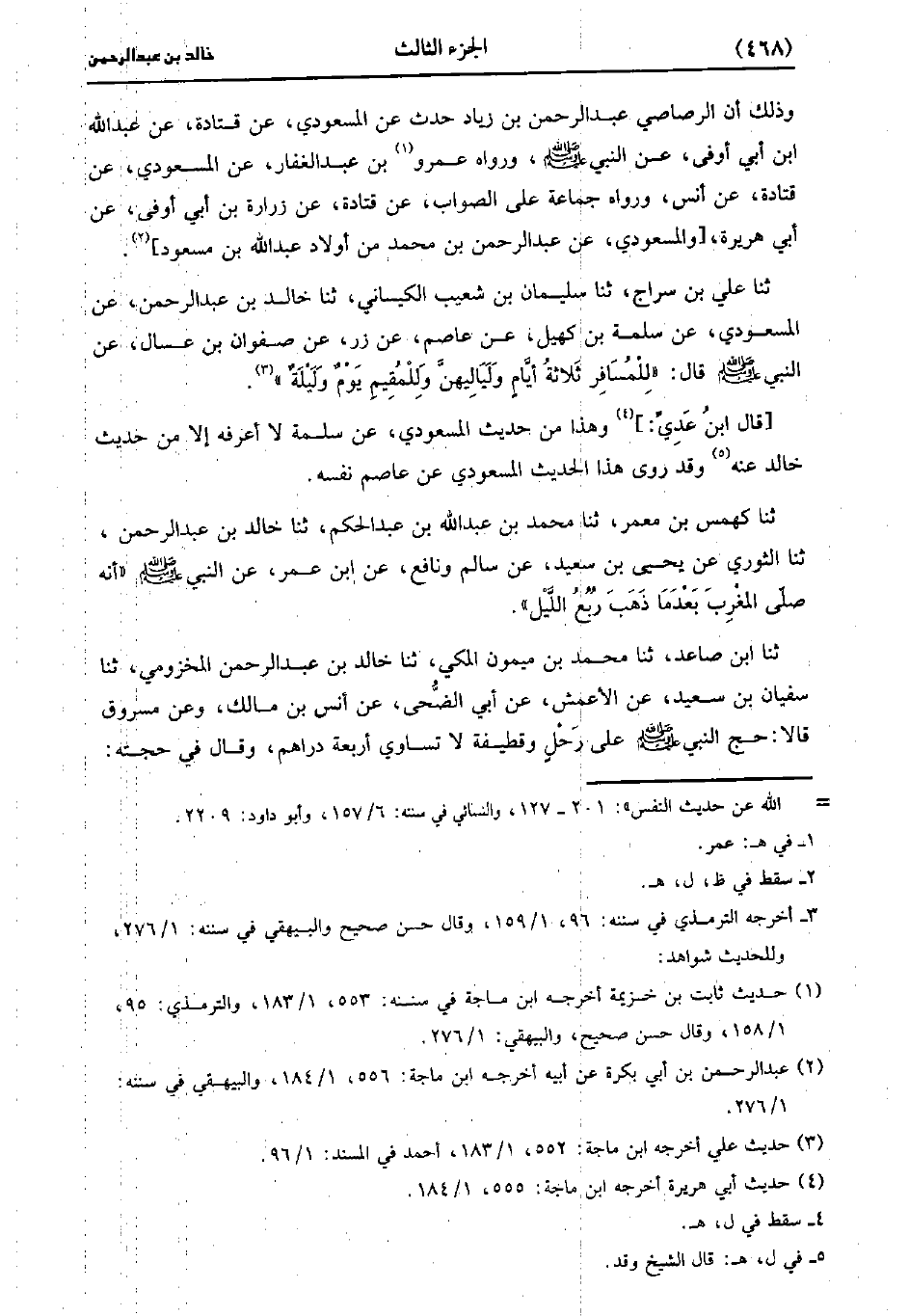 حَدَّثَنَا علي بن سراج، حَدَّثَنا سليمان بن شُعَيب الكيساني، حَدَّثَنا خَالِدُ بْنُ عَبد الرَّحْمَنِ عَن الْمَسْعُودِيِّ عَنْ سَلَمَةَ بْنِ كُهَيْلٍ، عَن عَاصِمٍ عَنْ زَرٍّ عَنْ صَفْوَانَ بْنِ عَسَّالٍ عَنِ النَّبِيِّ صَلَّى اللَّهُ عَلَيه وسَلَّم قَال: لِلْمُسَافِرِ ثَلاثَةُ أَيَّامٍ وَلَيَالِيهِنَّ وَلِلْمُقِيمِ يَوْمٌ وَلَيْلَةٌ.