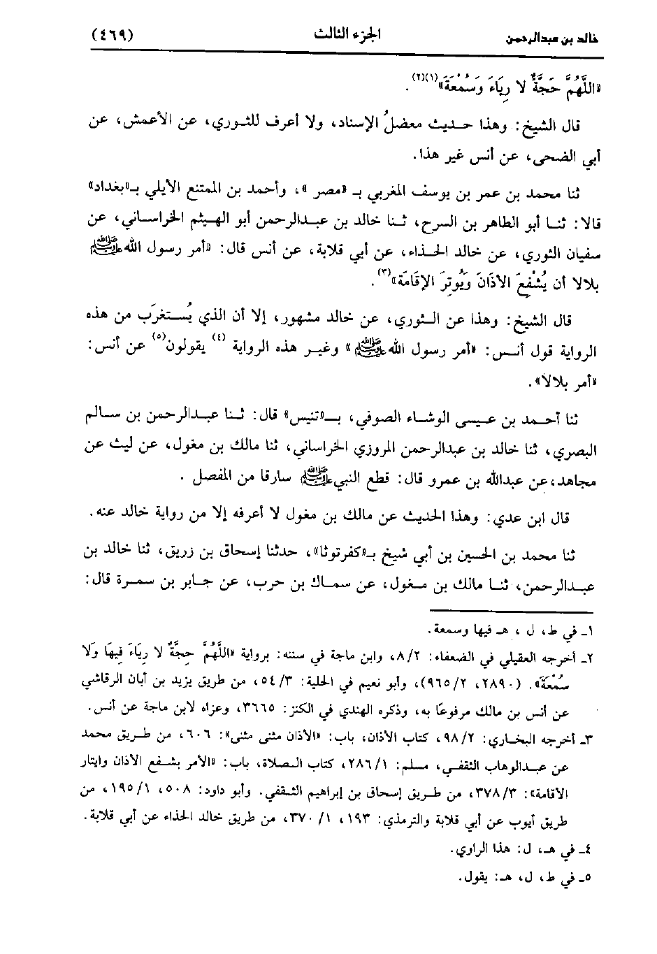حَدَّثَنَا مُحَمد بْنُ عُمَر بْنِ يُوسُفَ الْمَغْرِبِيُّ بِمِصْرَ وَأَحْمَدُ بْنُ الممتنع الأيلي ببغداد، قالا: حَدَّثَنا أَبُو الطَّاهِرِ بْنُ السَّرْحِ، حَدَّثَنا خالد بن عَبد الرحمن أبو الْهَيْثَمِ الْخُرَاسَانِيُّ عَنْ سُفْيَانَ الثَّوْريّ عَنْ خَالِدٍ الْحَذَّاءِ، عَن أَبِي قِلابَةَ، عَن أَنَس قَالَ أَمَرَ رَسُولِ اللَّهِ صَلَّى اللَّهُ عَلَيْهِ وَسَلَّمَ بِلالا أَنْ يُشْفِعَ الأَذَانَ وَيُوتِرَ الإِقَامَةَ.