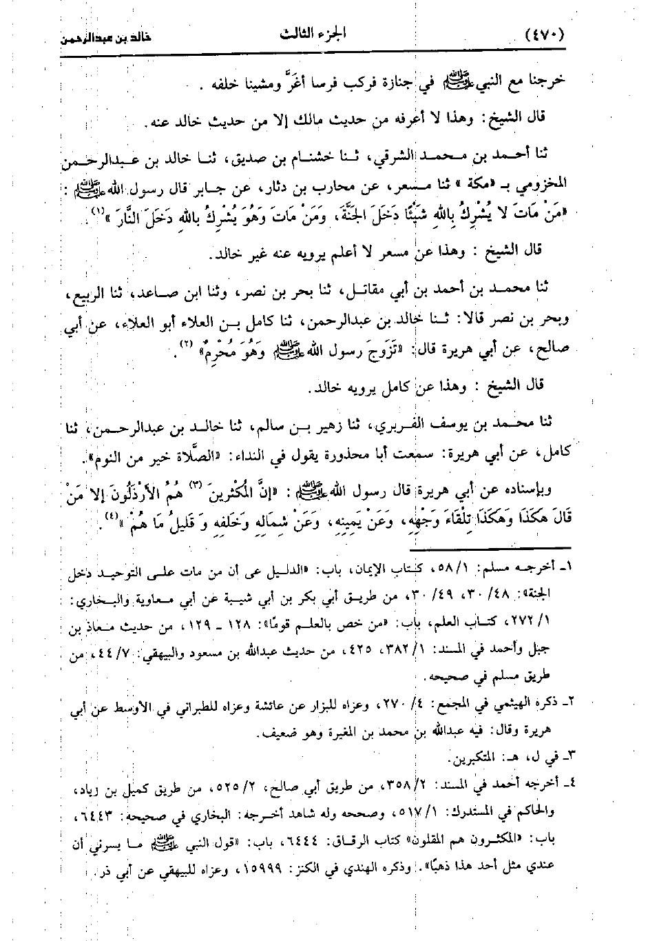 حَدَّثَنَا أحمد بن مُحَمد الشرقي، حَدَّثَنا خشنام بن صديق، حَدَّثَنا خَالِدُ بْنُ عَبد الرَّحْمَنِ الْمَخْزُومِيُّ بمكة، حَدَّثَنا مِسْعَرٌ عَنْ مُحَارِبِ بْنِ دِثَارٍ عَنْ جَابِرٍ قَال رَسُول اللهِ صَلَّى اللَّهُ عَلَيهِ وَسلَّمَ مِنَ مَاتَ لا يُشْرِكُ بِاللَّهِ شَيْئًا دَخَلَ الْجَنَّةَ، ومَنْ مَاتَ، وَهو يُشْرِكُ بِاللَّهِ دَخَلَ النَّارَ.