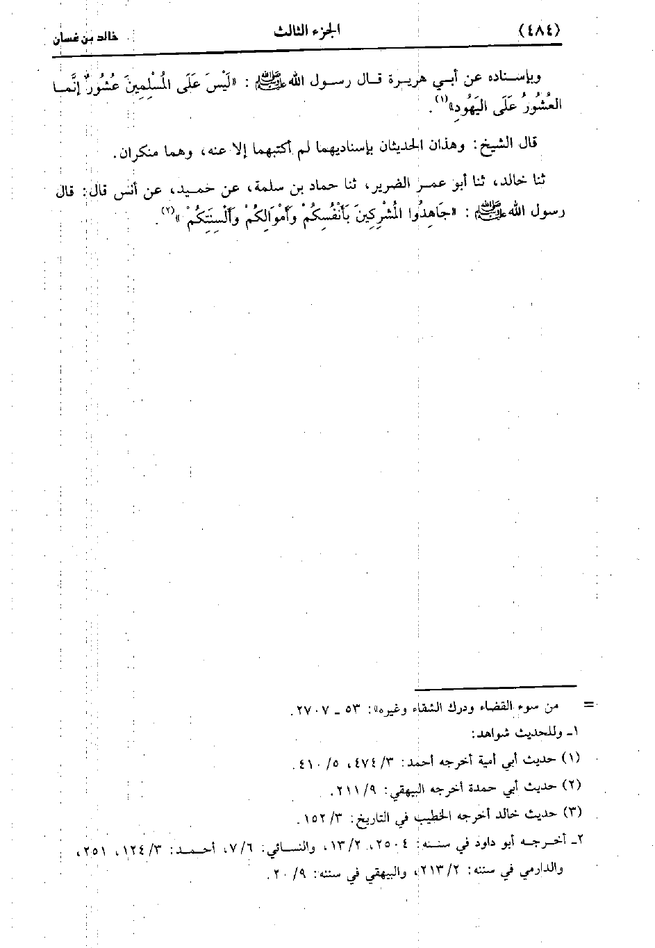 حَدَّثَنَا خالد، حَدَّثَنا أبو عُمَر الضرير، حَدَّثَنا حَمَّادُ بْنُ سَلَمَةَ، عَنْ حُمَيْدٍ، عَن أَنَس، قَال: قَال رَسُولِ اللَّهِ صَلَّى اللَّهُ عَلَيْهِ وَسَلَّمَ جَاهِدُوا الْمُشْرِكِينَ بِأَنْفُسِكُمْ وَأَمْوَالِكُمْ وألسنتكم