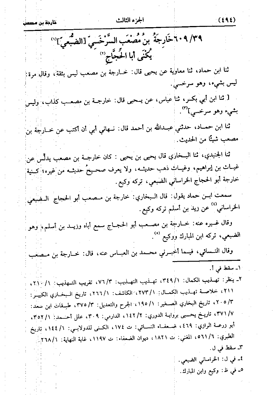 حَدَّثَنَا الجنيدي، حَدَّثَنا البُخارِيّ قال يَحْيى بن يَحْيى كان خارجة بن مصعب يدلس عن غياث بن إبراهيم وغياث ذهب حديثه، ولاَ يعرف صحيح حديثه من غيره كنية خارجة أبو الحجاج الخراساني الضبعي تركه وكيع.