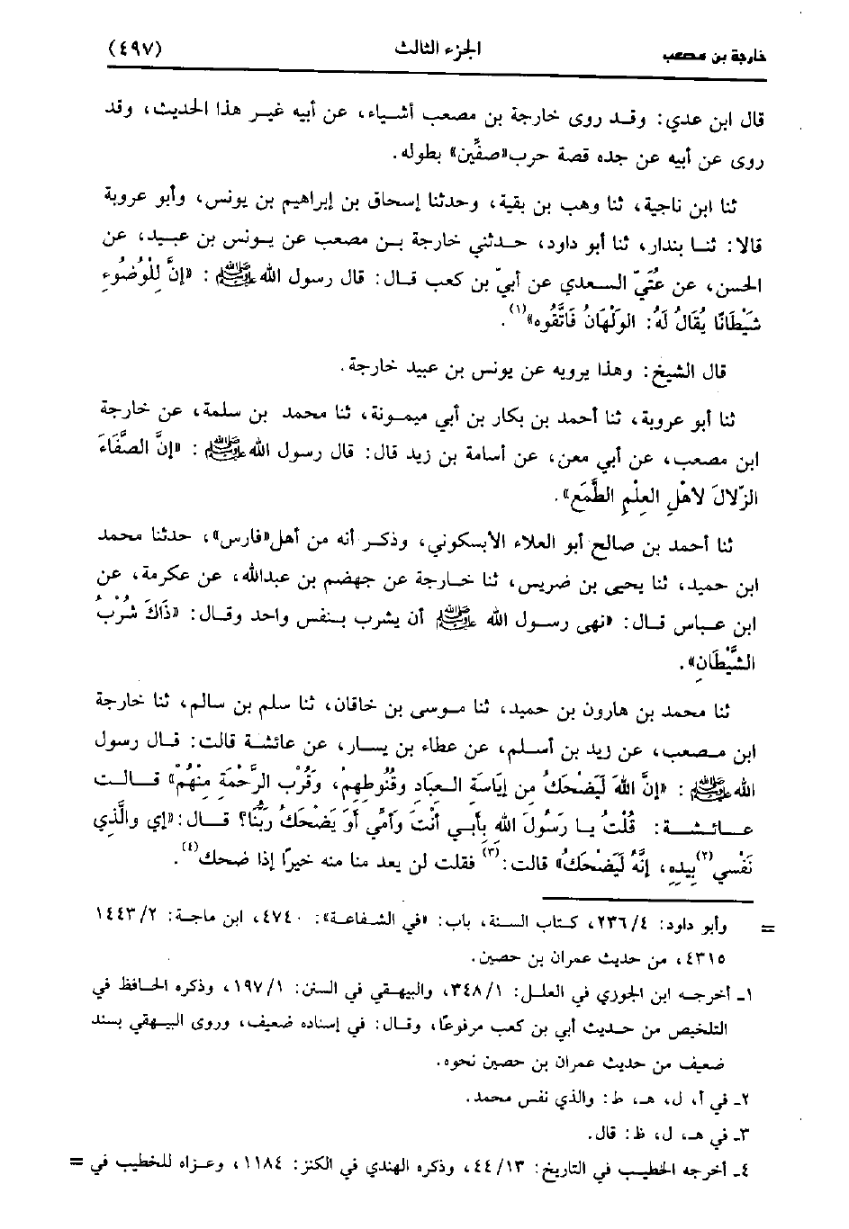 حَدَّثَنَا أَبُو عَرُوبة، حَدَّثَنا أَحْمَدُ بْنُ بكار بن أبي ميمونة، حَدَّثَنا مُحَمد بْنُ سَلَمَةَ، عَنْ خَارِجَةَ بْنِ مُصْعَبٍ، عَن أَبِي مَعْنٍ عَنْ أُسَامَةَ بْنِ زَيْدٍ، قَال: قَال رَسُولُ اللَّهِ صَلَّى اللَّهُ عَلَيْهِ وَسَلَّمَ إِنَّ الصَّفَاءَ الزلال لأهل العلم الطمع.