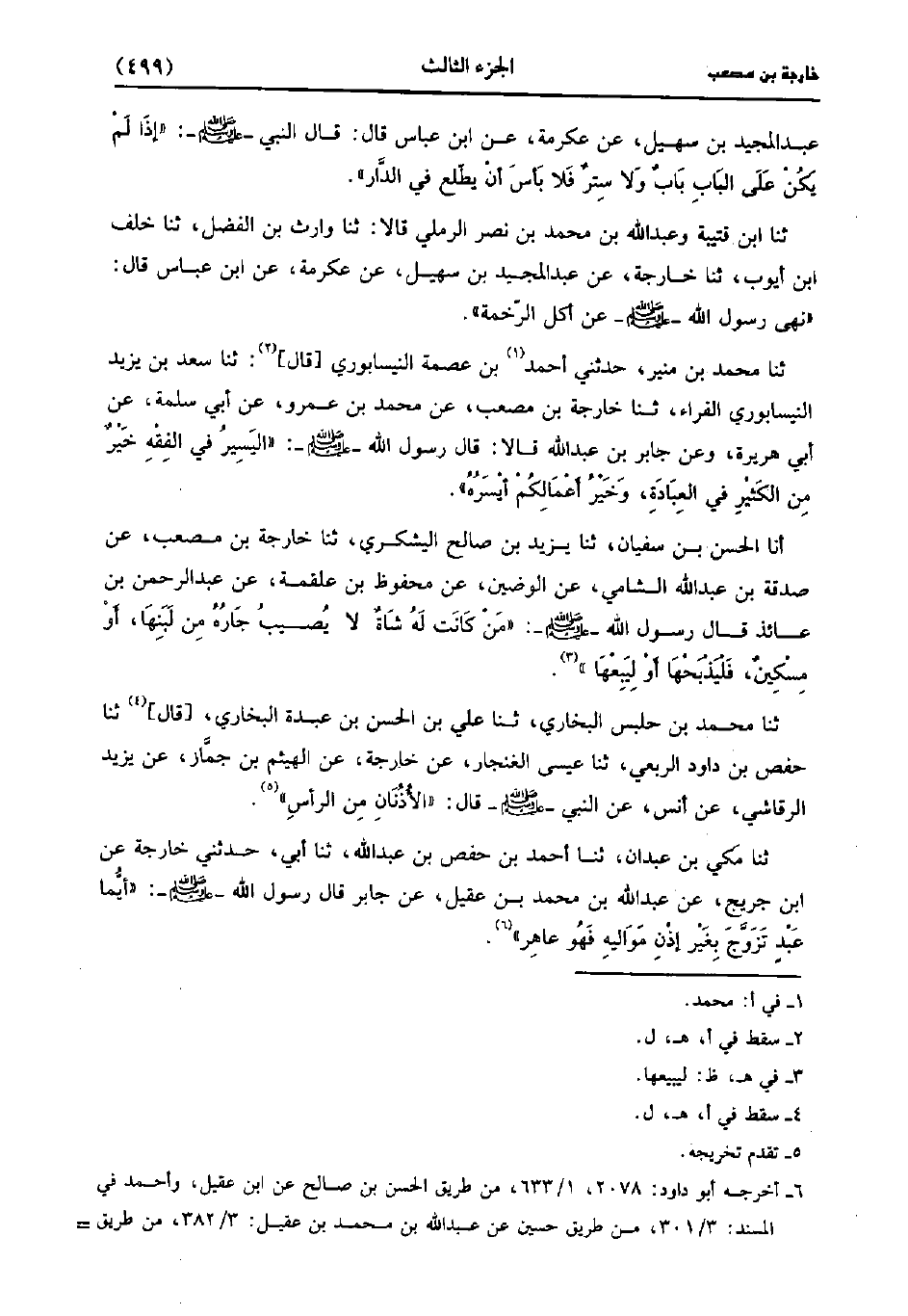 حَدَّثَنَا مَكِّيُّ بْنُ عَبْدَانَ، حَدَّثَنا أَحْمَدُ بْنُ حَفْصِ بْنِ عَبد الله، حَدَّثَنا أَبِي، حَدَّثني خَارِجَةُ، عنِ ابْنِ جُرَيج، عَن عَبد اللَّهِ بْنِ مُحَمد بْنِ عَقِيل عَنْ جَابِرٍ قَال رَسُول اللهِ صَلَّى اللَّهُ عَلَيهِ وَسلَّمَ أيما عَبد تزود بِغَيْرِ إِذْنِ مَوَالِيهِ فَهُوَ عَاهِرٌ