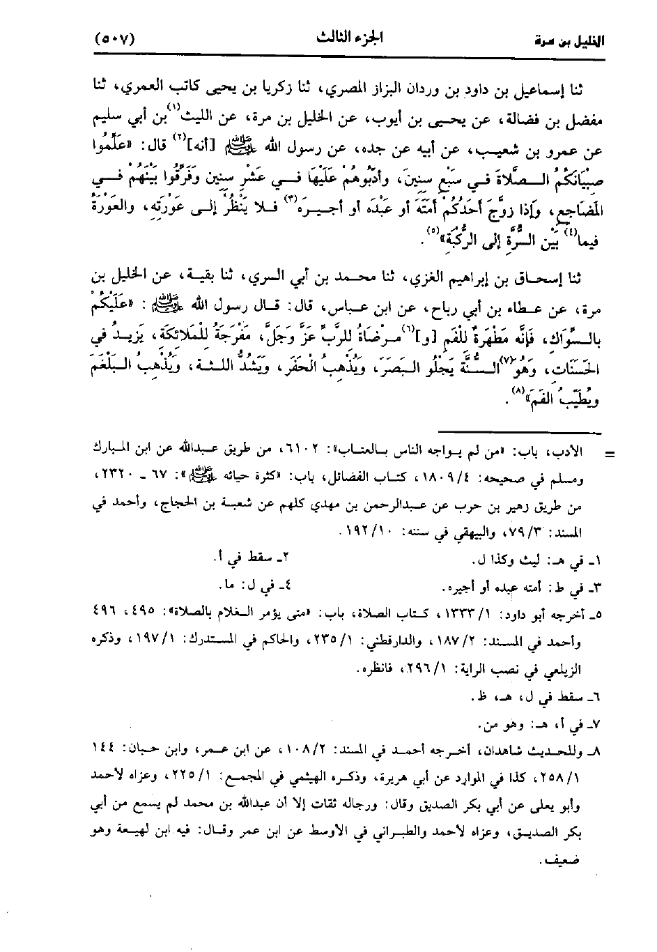 حَدَّثَنَا إِسْمَاعِيلُ بْنُ دَاوُدَ بْنِ وردان البزاز المصري، حَدَّثَنا زَكَرِيَّا بْنُ يَحْيى كَاتِبُ العُمَريّ، حَدَّثَنا مُفَضَّلُ بْنُ فَضَالَةَ، عَن يَحْيى بْنِ أَيُّوبَ، عَن الْخَلِيلِ بْنِ مُرَّةَ عَنِ اللَيْث بْنِ أبِي سُلَيم عَنْ عَمْرو بْنِ شُعَيب، عَنْ أَبِيهِ، عَن جَدِّهِ عَنْ رَسُولِ اللَّهِ صَلَّى اللَّهُ عَلَيْهِ وَسَلَّمَ أَنَّهُ قَالَ عَلِّمُوا صِبْيَانَكُمُ الصَّلاةَ فِي سَبْعِ سِنِينَ وَأَدِّبُوهُمْ عَلَيْهَا فِي عَشْرِ سِنِينَ وَفَرِّقُوا بَيْنَهُمْ فِي الْمَضَاجِعِ، وَإذا زَوَّجَ أحدكم أمته عَبْدَهُ وَأَجِيرَهُ فَلا يَنْظُرْ إِلَى عَوْرَتِهِ وَالْعَوْرَةُ فِيمَا بَيْنَ السُّرَّةِ إلى الركبة.