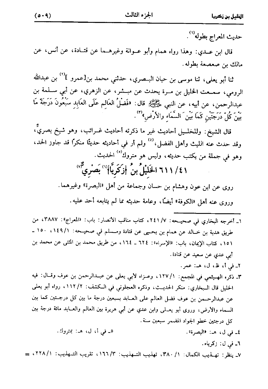 حَدَّثَنَا أَبُو يَعْلَى، حَدَّثَنا مُوسَى بْنُ حَيَّانَ الْبَصْرِيُّ، حَدَّثني مُحَمد بْنُ عَمْرو بْنِ عَبد اللَّهِ الرُّومِيُّ سَمِعْتُ الْخَلِيلَ بْنَ مُرَّةَ يُحَدِّثُ عَنْ مُبَشِّرٍ، عنِ الزُّهْريّ، عَن أَبِي سَلَمَةَ بْنِ عَبد الرَّحْمَنِ، عَنْ أَبِيهِ عَنِ النَّبِيِّ صَلَّى اللَّهُ عَلَيه وسَلَّم قَال: فَضَّلَ الْعَالِمِ عَلَى الْعَابِدِ سَبْعُونَ دَرَجَةً مَا بَيْنَ كُلِّ دَرَجَتَيْنِ كَمَا بَيْنَ السَّمَاءِ وَالأَرْضِ.