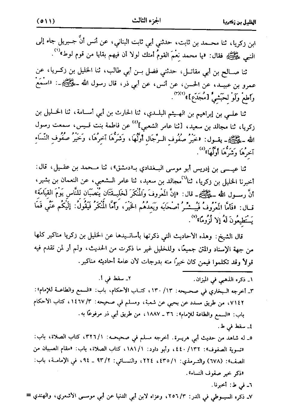 قال الشَّيْخُ: وَهَذِهِ الأَحَادِيثُ الَّتِي ذَكَرْتُهَا بأسانيدها عن الخليل بن زكريا مناكير كلها من جهة الإسناد والمتن جميعا وللخليل غير ما ذكرت من الحديث ولم أر لمن تقدم فيه قولا وقد تكلموا فيمن كان خيرا منه بدرجات لأَن عامة أحاديثه مناكير