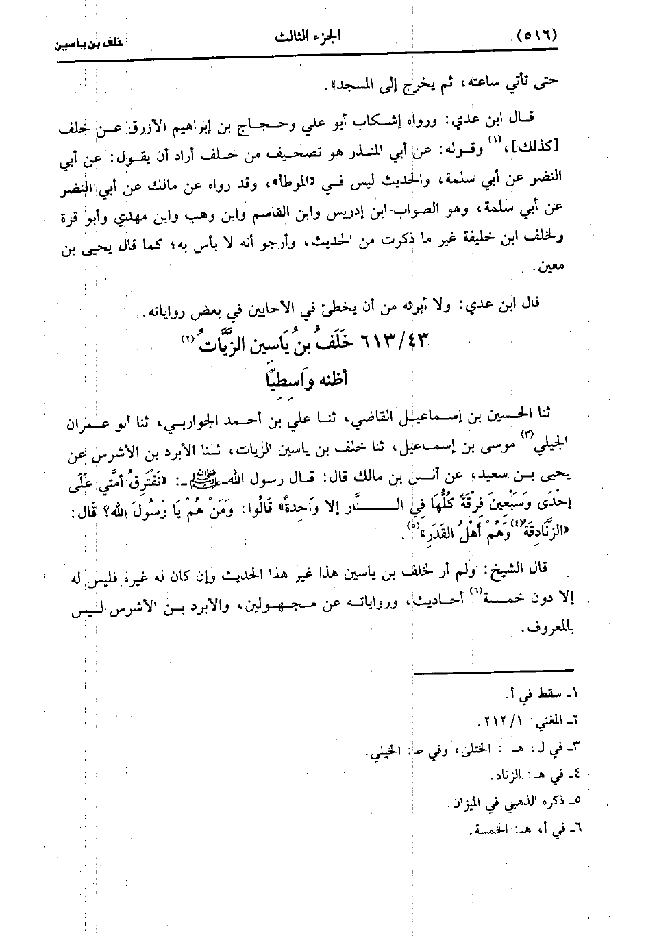 قال الشيخ: ولم أر لخلف بن ياسين هذا غير هذا الحديث، وإن كان له غيره فليس له إلا دون خمسة أحاديث ورواياته عن مجهولين والأبرد بن الأشرس ليس بالمعروف