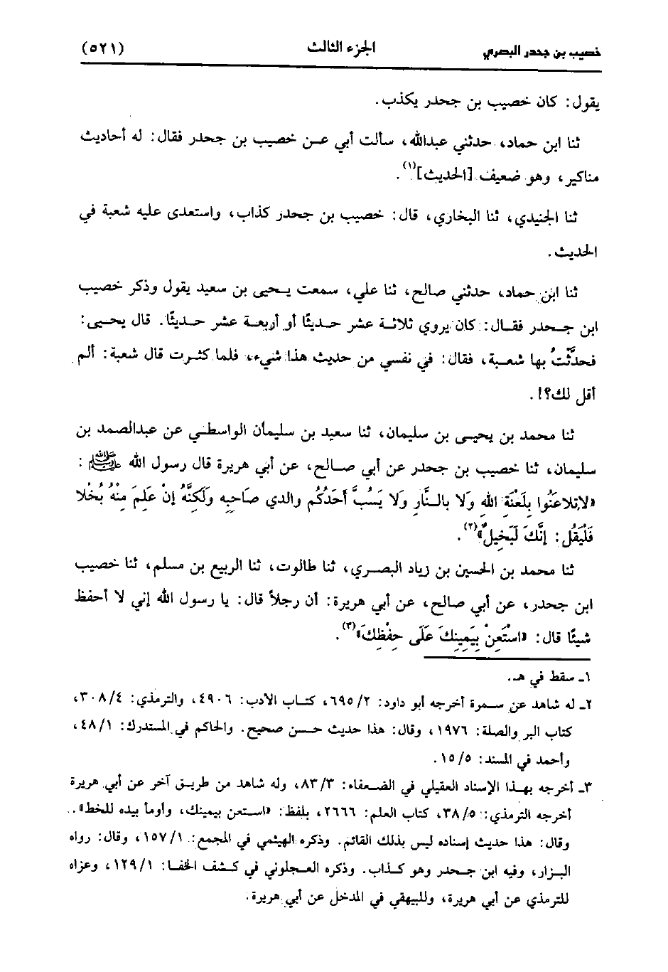 حَدَّثَنَا مُحَمد بْنُ يَحْيى بْنِ سُلَيْمَانَ، حَدَّثَنا سَعِيد بْنُ سُلَيْمَانَ الْوَاسِطِيُّ عَنْ عَبد الصَّمَدِ بْنِ سليمان، حَدَّثَنا خُصَيْبُ بْنُ جَحْدَرٍ، عَن أَبِي صَالِحٍ، عَن أَبِي هُرَيْرَةَ قَال رَسُول اللهِ صَلَّى اللَّهُ عَلَيهِ وَسلَّمَ: لاَ تُلاعِنُوا بِلَعْنَةِ اللَّهِ، ولاَ بِالنَّارِ، ولاَ يَسُبَّ أَحَدُكُمْ وَالِدَيْ صَاحِبِهِ وَلَكِنَّهُ إِنْ عَلِمَ مِنْهُ بُخْلا فَلْيقَلُ إِنَّكَ لَبَخِيلٌ.