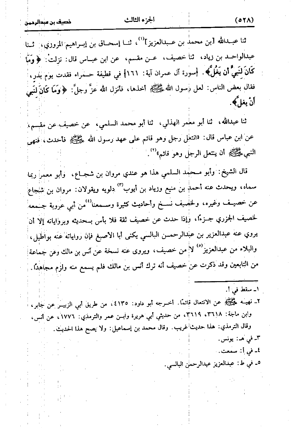 قال الشيخ: وأَبُو مُحَمد السلمي هذا هو عندي مروان بن شجاع، وأَبُو معمر ربما سماه ويحدث عنه أحمد بن منيع وزياد بن أيوب دلويه ويقولان مروان بن شجاع عن خصيف وغيره ولخصيف نسخ وأحاديث كثيرة وسمعنا من أبي عَرُوبة جمعه لخصيف الجزري جزءا، وَإذا حدث عن خصيف ثقة فلا بأس بحديثه وبرواياته إلاَّ أن يروي عنه عَبد العزيز بن عَبد الرحمن البالسي، يُكَنَّى أبا الأصبغ فإن رواياته عنه بواطيل والبلاء من عَبد العزيز لا من خصيف ويروي عنه نسخة، عَن أَنَس بن مالك وعن جماعة من التابعين وقد ذكرت عن خصيف أنه ترك أنس بن مالك فلم يسمع منه ولزم مجاهدا