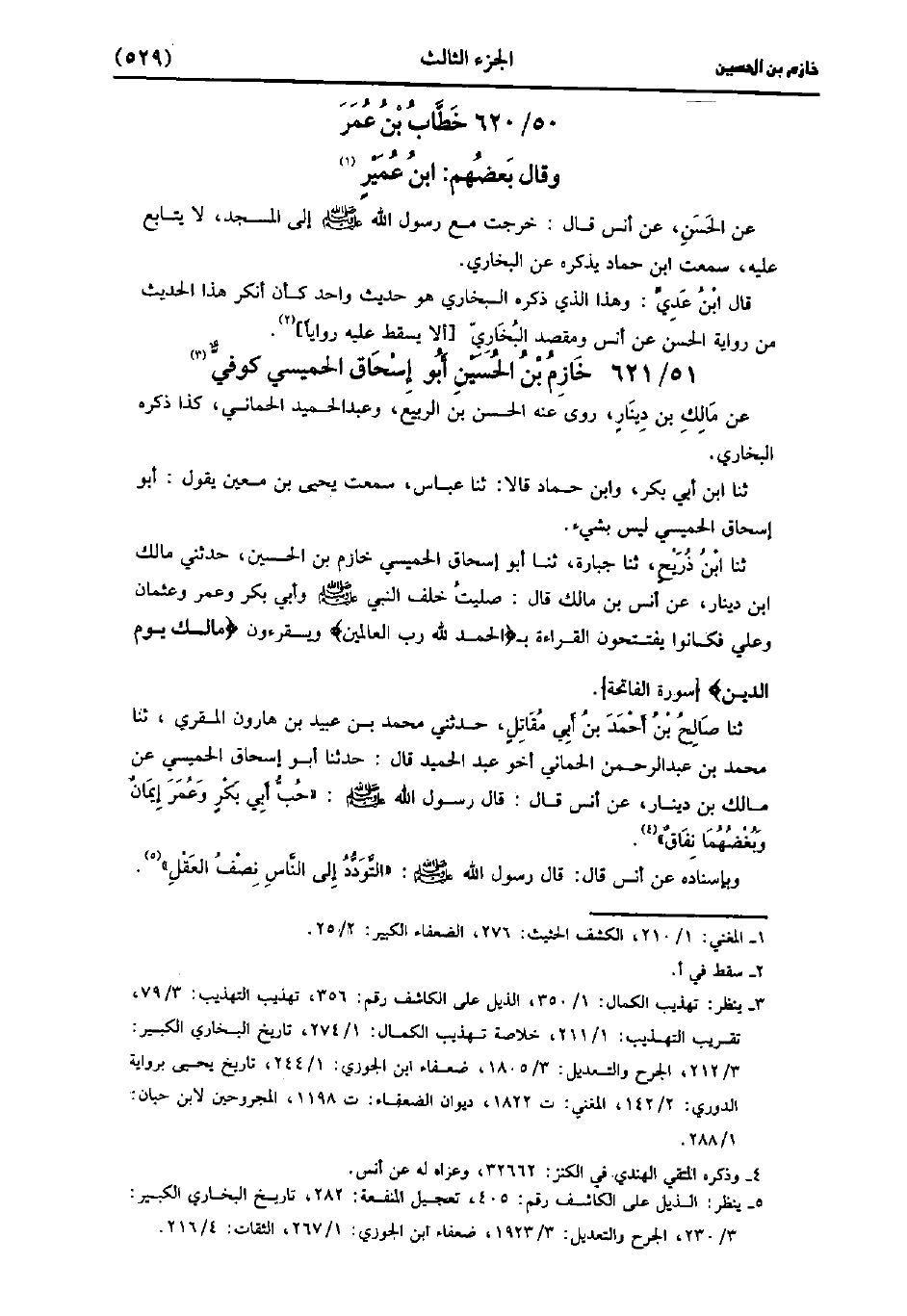 حَدَّثَنَا صَالِحُ بْنُ أَحْمَدَ بْنِ أَبِي مُقَاتِلٍ، حَدَّثني مُحَمد بْنُ عُبَيد بن هارون المقرئ، حَدَّثَنا مُحَمد بْنُ عَبد الرَّحْمَنِ الْحِمَّانِيُّ أَخُو عَبد الْحَمِيدِ، قَال: حَدَّثَنا أَبُو إِسْحَاقَ الْحُمَيْسِيُّ عَنْ مَالِكِ بْنِ دِينَارٍ، عَن أَنَس، قَال: قَال رَسُولُ اللَّهِ صَلَّى اللَّهُ عَلَيْهِ وَسَلَّمَ حُبُّ أَبِي بَكْرٍ وَعُمَرَ إِيمَانٌ وَبُغْضُهُمَا نِفَاقٌ.