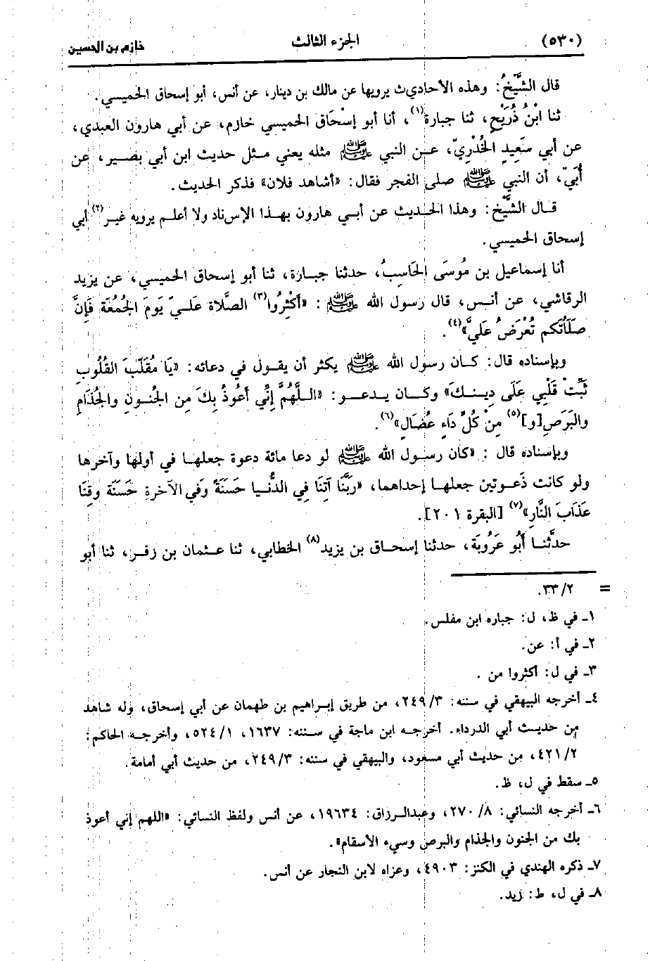 حَدَّثَنَا إِسْمَاعِيلُ بْنُ مُوسَى الْحَاسِبُ، حَدَّثَنا جبارة، حَدَّثَنا أَبُو إِسْحَاقَ الْحُمَيْسِيُّ عَنْ يَزِيدَ الرَّقَّاشِيِّ، عَن أَنَس قَال رَسُول اللهِ صَلَّى اللَّهُ عَلَيهِ وَسلَّمَ أَكْثِرُوا الصَّلاةَ عَلَيَّ يَوْمَ الْجُمُعَةِ فَإِنَّ صَلاتَكُمْ تُعْرَضُ عَلَيَّ.