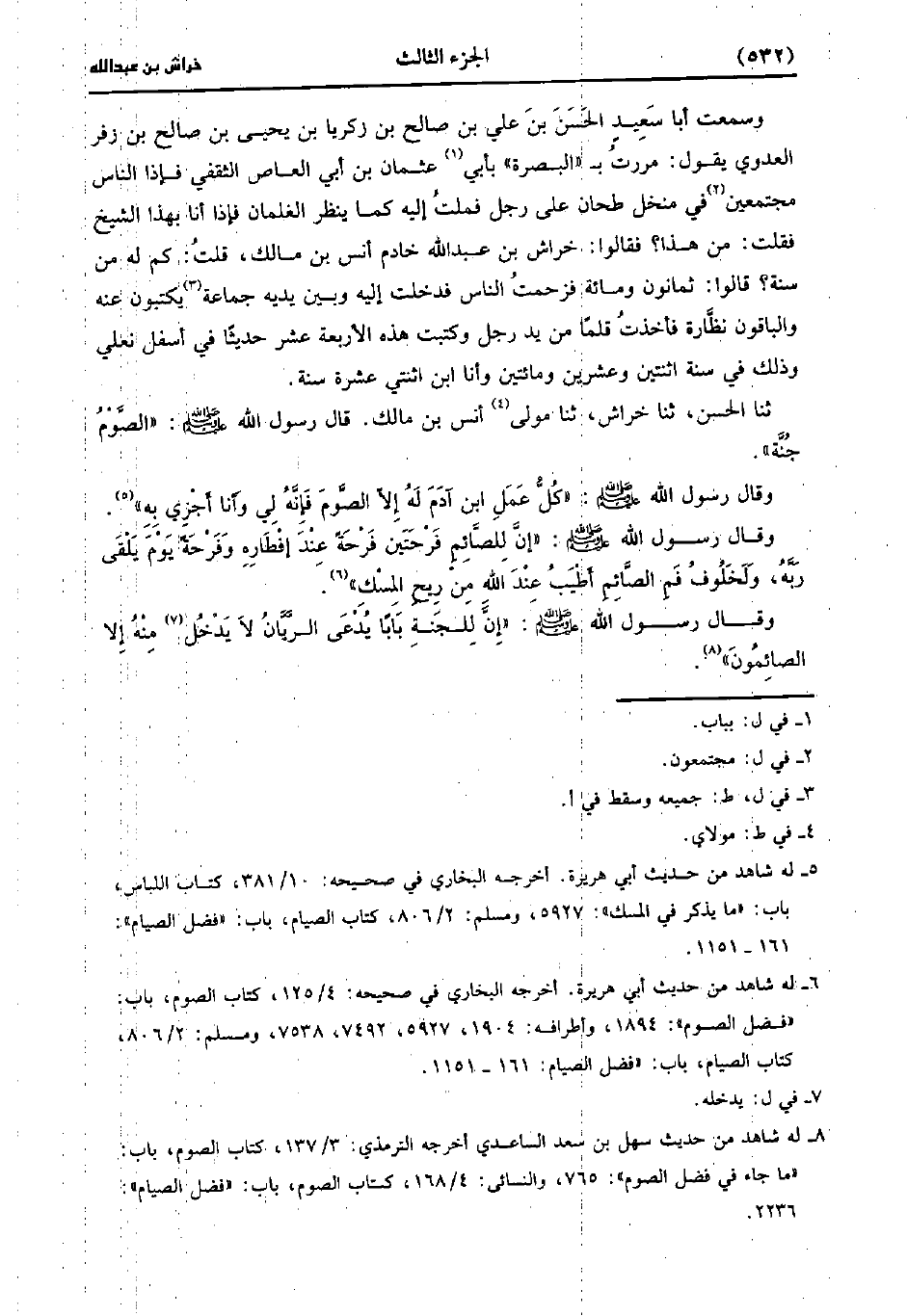 حَدَّثَنَا الحسن، حَدَّثَنا خراش، حَدَّثَنا مَوْلايَ أَنَسُ بْنُ مَالِكٍ قَال رَسُول اللهِ صَلَّى اللَّهُ عَلَيهِ وَسلَّمَ الصَّوْمُ جُنَّةٌ وَقَالَ رَسُولُ اللَّهِ صَلَّى اللَّهُ عَلَيْهِ وَسَلَّمَ كل عمل بن آدَمَ لَهُ إلاَّ الصَّوْمَ فَإِنَّهُ لِي وَأَنَا أَجْزِي بِهِ.