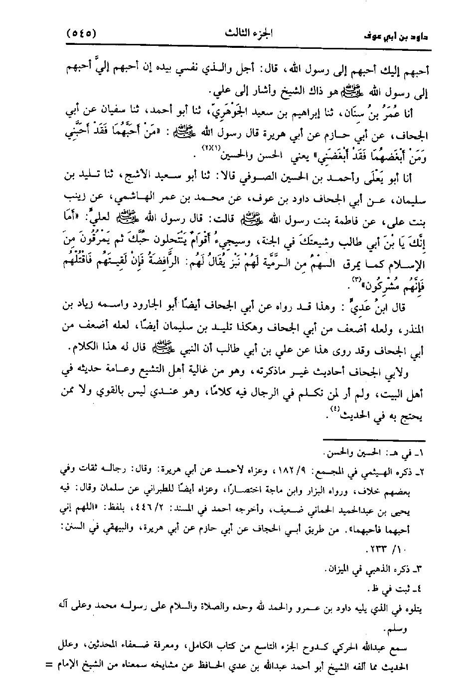 حَدَّثَنَا عُمَر بْنُ سِنَانٍ، حَدَّثَنا إِبْرَاهِيمُ بْنُ سَعِيد الْجَوْهَرِيُّ، حَدَّثَنا أبو أحمد، حَدَّثَنا سُفيان، عَن أَبِي الْجُحَافِ، عَن أَبِي حَازِمٍ، عَن أَبِي هُرَيْرَةَ قَال رَسُول اللهِ صَلَّى اللَّهُ عَلَيهِ وَسلَّمَ مَنْ أَحَبَّهُمَا فَقَدْ أَحَبَّنِي، ومَنْ أَبْغَضَهُمَا فَقَدْ أَبْغَضَنِي يعني الحسن والحسين.