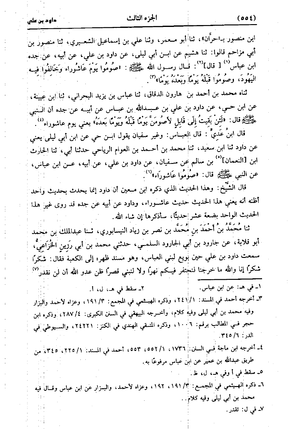 بن منصور بن بحران، حَدَّثَنا أبو معمر وَحَدَّثنا عَلِيُّ بْنُ إِسْمَاعِيلَ الشَّعِيرِيُّ، حَدَّثَنا مَنْصُورُ بْنُ أَبِي مُزَاحِمٍ قَالُوا، حَدَّثَنا هُشَيْمٌ، عنِ ابْنِ أَبِي لَيْلَى عَنْ دَاوُدَ بْنِ عَلِيٍّ، عَنْ أبيه، عَن جَدِّهِ بن عَبَّاسٍ، قَال: قَال رَسُولُ اللَّهِ صَلَّى اللَّهُ عَلَيْهِ وَسَلَّمَ صُومُوا يَوْمَ عَاشُورَاءَ وَخَالِفُوا فِيهِ الْيَهُودَ وَصُومُوا قَبْلَهُ يَوْمًا وَبَعْدَهُ يَوْمًا.