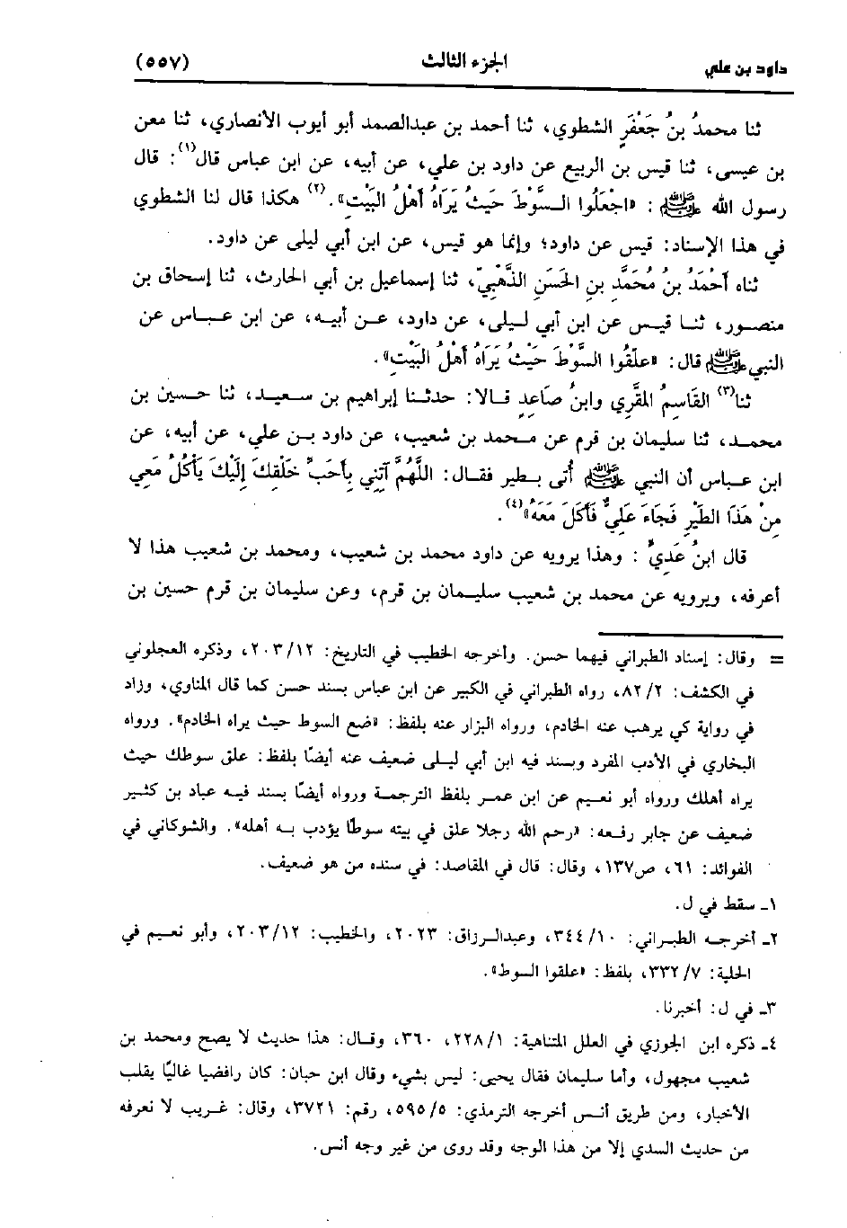 حَدَّثَنَا الْقَاسِمُ الْمَقَّرِيُّ، وَابْنُ صَاعِدٍ، قَالا: حَدَّثَنا إِبْرَاهِيمُ بْنُ سَعِيد، حَدَّثَنا حسين بْنُ مُحَمد، حَدَّثَنا سُلَيْمَانُ بْنُ قَرْمٍ عَنْ مُحَمد بْنِ شُعَيب عَنْ دَاوُدَ بْنِ عَلِيٍّ، عَنْ أَبِيهِ، عنِ ابْنِ عَبَّاسٍ أَنّ النَّبِيُّ صَلَّى اللَّهُ عَلَيهِ وَسلَّمَ أُتِيَ بِطَيْرٍ فَقَالَ اللَّهُمَّ آتِنِي بِأَحَبَّ خَلْقِكَ إِلَيْكَ يَأْكُلُ مَعِي مِنْ هَذَا الطَّيْرِ فَجَاءَهُ عَلِيٌّ فَأَكَلَ مَعَهُ.