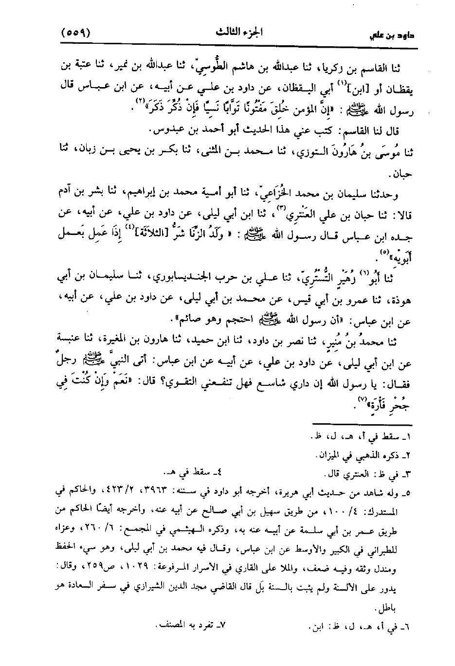 قال لنا القاسم كتب عني هذا الحديث أبو أحمد بن عبدوس، حَدَّثَنا مُوسَى بْنُ هَارُونَ التُّوزِيُّ، حَدَّثَنا مُحَمد بْنُ الْمُثَنَّى، حَدَّثَنا بَكْرُ بْنُ يَحْيَى بْنِ زَبَّانَ، حَدَّثَنا حبان (ح) وَحَدَّثَنَا سُلَيْمَانُ بْنُ مُحَمد الْخُزَاعِيُّ، حَدَّثَنا أَبُو أُمَيَّةَ مُحَمد بْنُ إبراهيم، حَدَّثَنا بشر بن آدم، قالا: حَدَّثَنا حبان بن علي العنزي، حَدَّثَنا ابْنُ أَبِي لَيْلَى عَنْ دَاوُدَ بْنِ عَلِيٍّ، عَنْ أَبِيهِ، عَن جَدِّهِ بْنِ عَبَّاسٍ قَال رَسُول اللهِ صَلَّى اللَّهُ عَلَيهِ وَسلَّمَ وَلَدُ الزِّنَا شَرُّ الثَّلاثَةِ إِذَا عَمِلَ بعمل أبويه.
