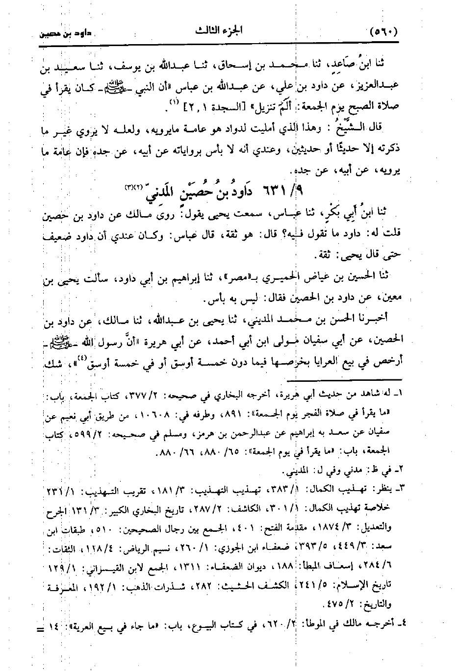 حَدَّثَنَا ابْنُ صَاعِدٍ، حَدَّثَنا مُحَمد بن إسحاق، حَدَّثَنا عَبد الله بن يوسف، حَدَّثَنا سَعِيد بْنِ عَبد الْعَزِيزِ عَنْ دَاوُدَ بْنِ عَلِيٍّ عَنْ عَبد اللَّهِ بْنِ عَبَّاسٍ أَنَّ النَّبِيَّ صَلَّى اللَّهُ عَلَيهِ وَسلَّمَ كَانَ يَقْرَأُ فِي صَلاةِ الصُّبْحِ يَوْمَ الجمعة ألم تنزيل.