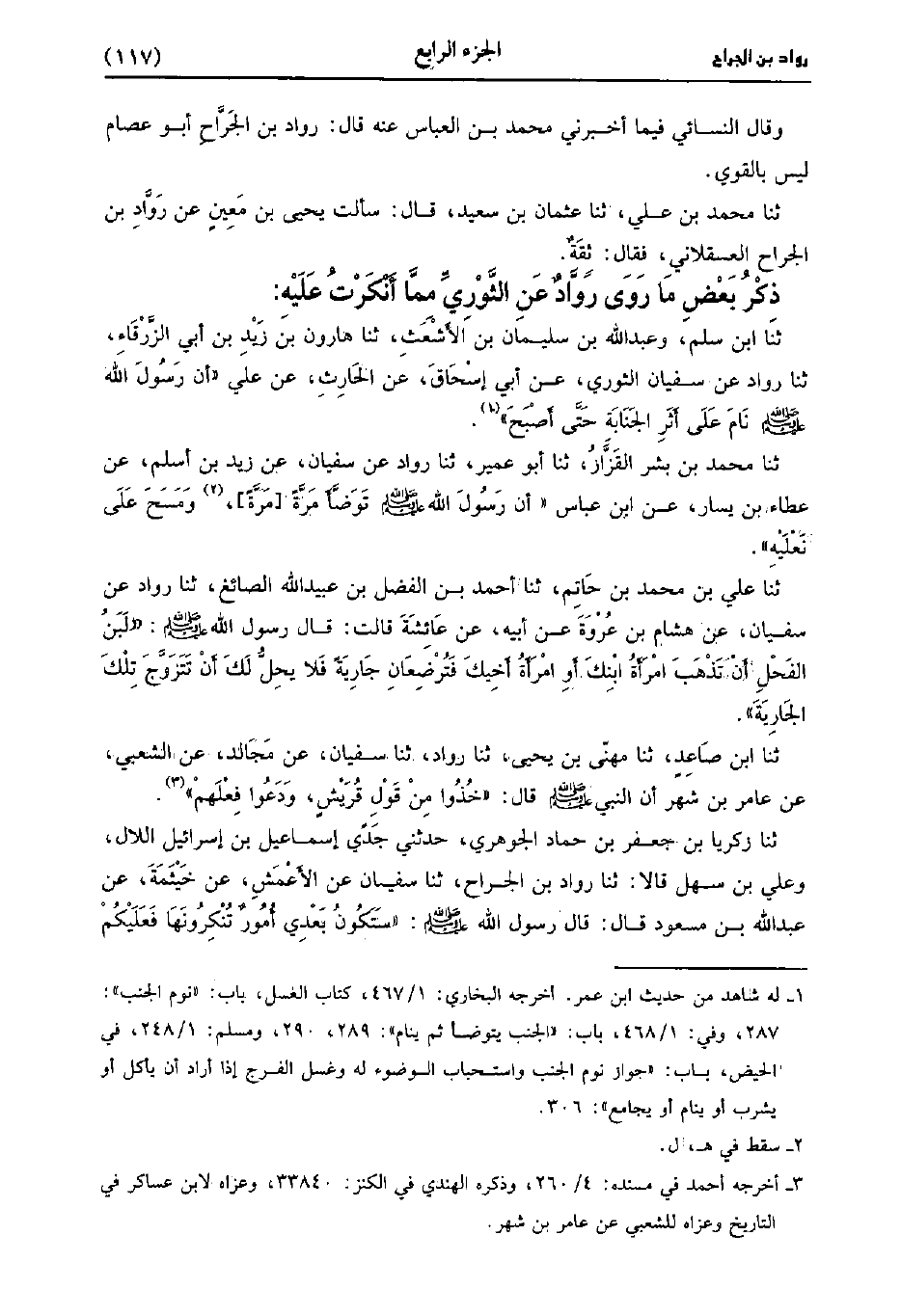 حَدَّثَنَا ابْنُ سَلَمٍ، وَعَبد اللَّهِ بْنُ سليمان بن الأشعث، حَدَّثَنا هَارُونُ بْنُ زَيْدِ بْنِ أَبِي الزرقاء، حَدَّثَنا رَوَّاد، عَنْ سُفْيَانَ الثَّوْريّ، عَن أَبِي إِسْحَاقَ عَنِ الْحَارِثِ عَنْ عَلِيٍّ أَنَّ رَسُولَ اللَّهِ صَلَّى اللَّهُ عَلَيْهِ وَسَلَّمَ نَامَ عَلَى أثر الجنابة حتى أصبح.