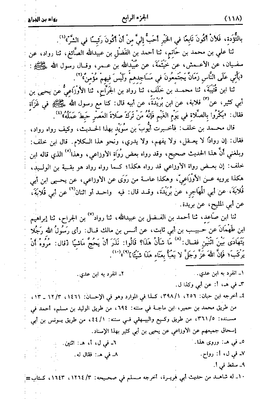 قَالَ مُحَمد بْنُ خَلَفٍ فَأَخْبَرْتُ أَيُّوبَ بْنِ سُوَيدٍ بِهَذَا الْحَدِيثِ وَكَيْفَ رَوَاهُ رواد فقال إن رواد لا يَعْقِلُ، ولاَ يَفْهَمُ، ولاَ يَدْرِي وَنَحْوِ هَذَا الْكَلامِ قال ابْن خلف وبلغني إن هذا الحديث صحيح وقد رواه بعض رواة الأَوْزاعِيّ وهذا الذي قاله بن خلف أن بعض رواة الأَوْزاعِيّ قد رواه هكذا كما رواه رَوَّاد هو بقية بْن الوليد هكذا يرويه عن الأَوْزاعِيّ وهكذا عامة من روى عن الأَوْزاعِيّ، عَن يَحْيى بْن أبي قلابة، عَن أبي المهاجر عن بريدة وقد قال فيه واحد أو اثنان، عَن أبي قلابة، عَن أبي المليح عن بريدة.