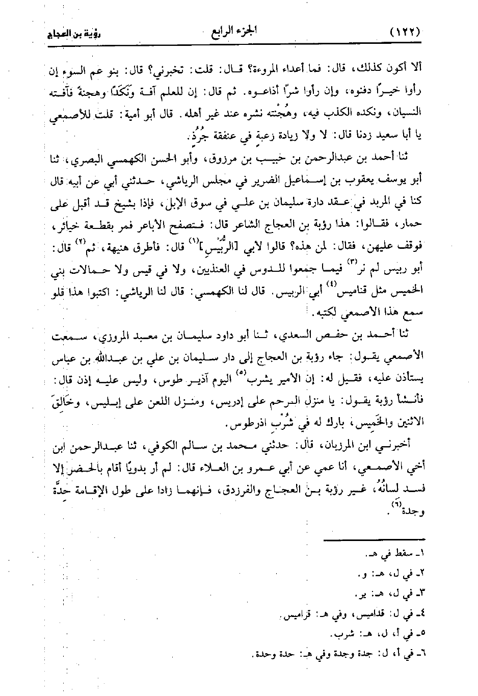 أخبرني بن الْمَرْزُبَانِ، قَال: حَدَّثني مُحَمد بْنُ سالم الكوفي، حَدَّثَنا عَبد الرحمن بن أَخِي الأَصْمَعِيِّ أَنَا عَمِّي، عَن أَبِي عَمْرو بْنِ الْعَلاءِ قَالَ لَمْ أَرَ بَدَوِيًّا أَقَامَ بِالْحَضَرِ إلاَّ فَسَدَ لِسَانَهُ غير رؤبة بْن العجاج والفرزدق فإنهما زادا عل طول الإقامة حدة وجدة