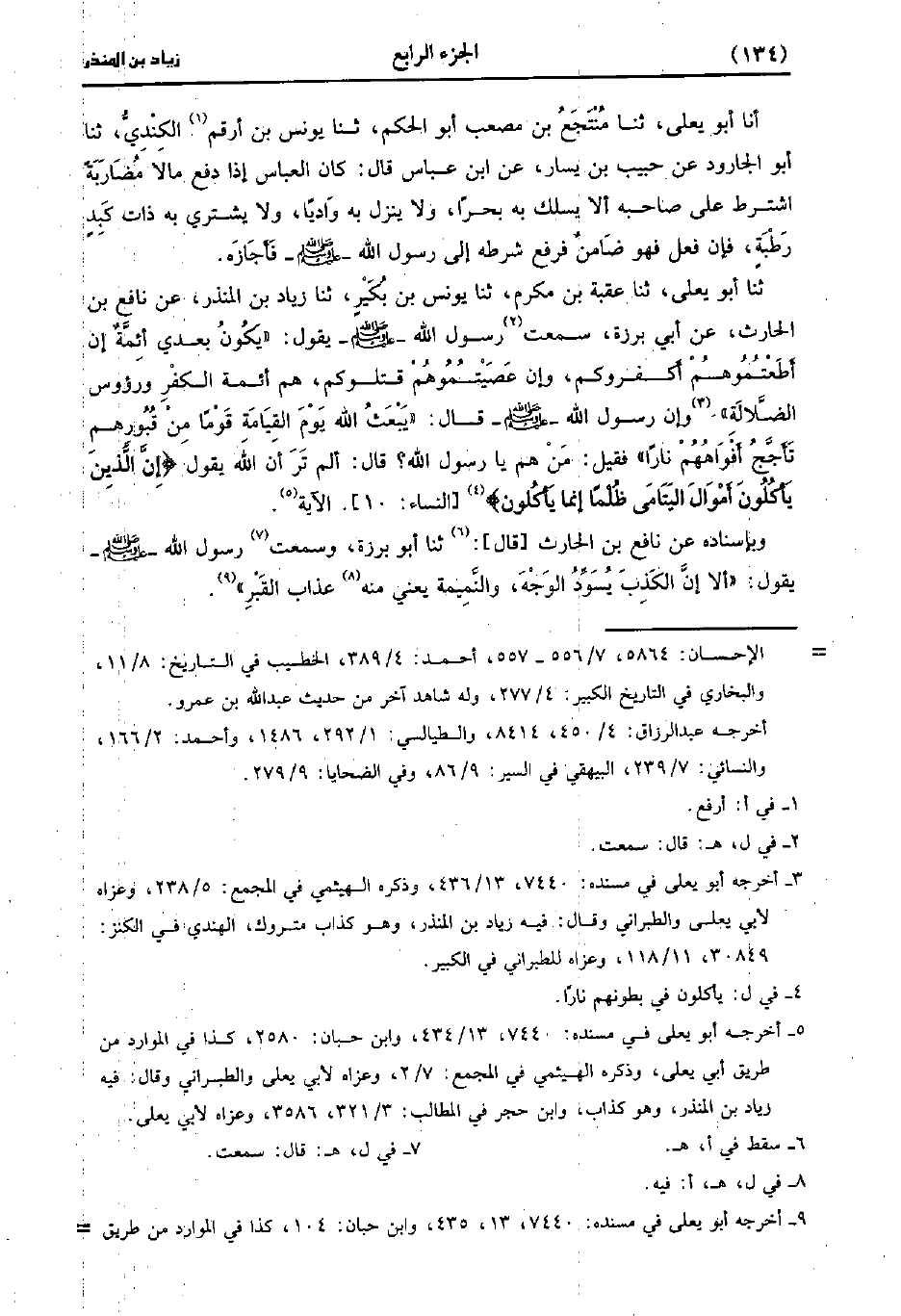 حَدَّثَنَا أبو يعلى، حَدَّثَنا عقبة بن مكرم، حَدَّثَنا يُونُس بن بُكَير، حَدَّثَنا زِيَادُ بْنُ الْمُنْذِرِ عَنْ نَافِعِ بْنِ الْحَارِثِ، عَن أَبِي بَرْزَةَ سَمِعْتُ رَسُولَ اللَّهِ صَلَّى اللَّهُ عَلَيْهِ وَسَلَّمَ يقول بَعْدِي أَئِمَّةٌ إِنْ أَطَعْتُمُوهُمْ أَكْفَرُوكُمْ وَإِنْ عَصَيْتُمُوهُمْ قَتَلُوكُمْ هُمْ أَئِمَّةُ الكفر ورؤوس الضَّلالَةِ وَإِنَّ رَسُولَ اللَّهِ صَلَّى الله عَلَيْهِ وَسَلَّمَ صَلَّى اللَّهُ عَلَيه وسَلَّم قَال: يَبْعَثُ اللَّهُ يَوْمَ الْقِيَامَةِ قَوْمًا مِنْ قُبُورِهِمْ تَأَجَّجُ أَفْوَاهُهُمْ نَارًا فَقِيلَ مَنْ هُمْ يَا رَسُولَ اللهِ قَالَ أَلَمْ تَرَ أَنَّ اللَّهَ يَقُولُ إِنَّ الَّذِينَ يَأْكُلُونَ أَمْوَالَ الْيَتَامَى ظُلْمًا إِنَّمَا يَأْكُلُونَ الآية.