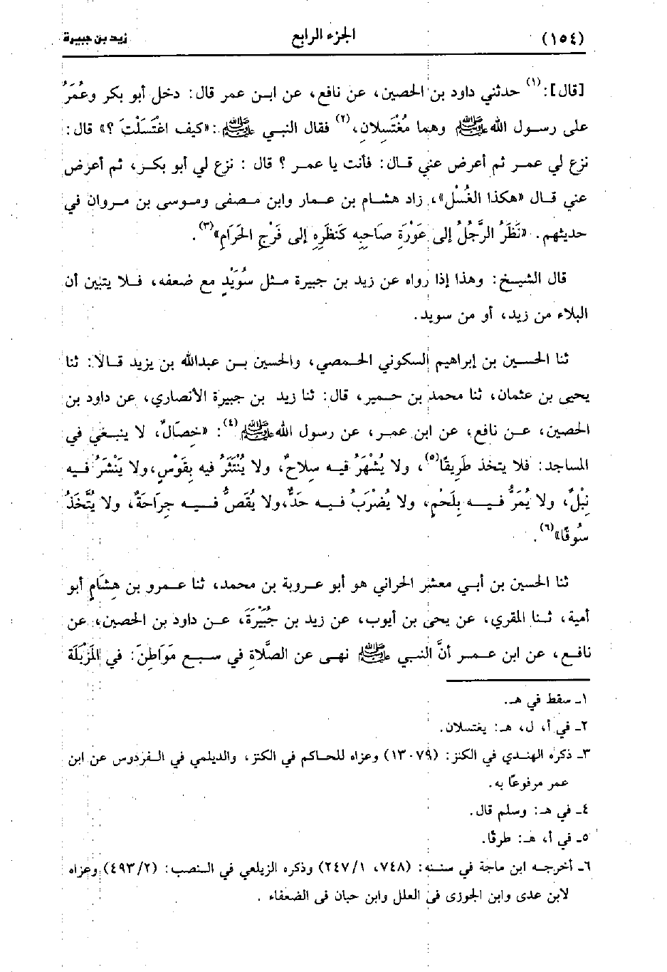 حَدَّثَنَا الْحُسَيْنُ بْنُ إِبْرَاهِيمَ السَّكُونِيُّ الْحِمْصِيُّ، وَالحُسَين بْنُ عَبد اللَّهِ بن يزيد، قَالا: حَدَّثَنا يَحْيى بْنُ عُثْمَانَ، حَدَّثَنا مُحَمد بن حمير قال وَحَدَّثنا زَيْدُ بْنُ جُبَيْرَةَ الأَنْصَارِيُّ عَنْ داود بن حُصَيْنٍ عَنْ نَافِعٍ، عنِ ابْنِ عُمَر عَنْ رَسُولِ اللَّهِ صَلَّى اللَّهُ عَلَيْهِ وَسَلَّمَ خِصَالٌ لا يَنْبَغِي فِي الْمَسَاجِدِ فَلا يُتَّخَذُ طَرِيقًا، ولاَ يُشْهَرُ فِيهِ سِلاحٌ، ولاَ يُنْتَثَرُ فِيهِ بِقَوْسٍ، ولاَ يُنْشَرُ فِيهِ نِبْلٌ، ولاَ يُمَرُّ فِيهِ بِلَحْمٍ، ولاَ يُضْرَبُ فِيهِ حَدٌّ، ولاَ يُقَصَّ فِيهِ جِرَاحَةٌ، ولاَ يتخذ سوقا.