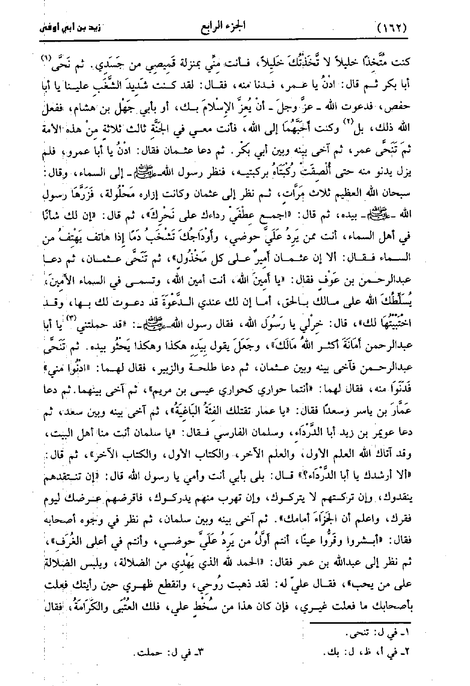 لَقَدْ كُنْتَ شَدِيدَ الشَّغْبِ عَلَيْنَا يَا أَبَا حَفْصٍ فَدَعَوْتُ اللَّهَ عَزَّ وَجَلَّ أَنْ يُعِزَّ الإِسْلامَ بِكَ أَوْ بِأَبِي جَهْلِ بْنِ هِشَامٍ فَفَعَلَ اللَّهُ ذَلِكَ بَلْ وَكُنْتَ أَحَبُّهُمَا إِلَى اللَّهِ فَأَنْتَ مَعِي فِي الجنة ثالث ثلاث مِنْ هَذِهِ الأُمَّةِ ثُمَّ تَنَحَّى عُمَر ثُمَّ آخَى بَيْنَهُ وَبَيْنَ أَبِي بَكْرٍ ثُمَّ دَعَا عُثْمَانَ فَقَالَ ادْنُ يَا أَبَا عَمْرو فَلَمْ يَزَلْ يَدْنُو مِنْهُ حَتَّى أُلْصِقَتْ رُكْبَتَاهُ بِرُكْبَتَيْهِ فَنَظَرَ رَسُولُ اللَّهِ صَلَّى اللَّهُ عَلَيْهِ وَسَلَّمَ إلى السماء وقال سحبان الله العظيم ثلاث مرار ثُمَّ نَظَرَ إِلَى عُثْمَانَ وَكَانَتْ إِزَارُهُ مَحْلُولَةً فَزَرَّهَا رَسُولُ اللَّهِ صَلَّى اللَّهُ عَلَيْهِ وَسَلَّمَ بِيَدِهِ ثُمَّ قَالَ اجْمَعْ عَطْفَيْ رِدَاءَكَ عَلَى نَحْرِكَ ثُمَّ، قَال: إِنَّ لَكَ شَأْنًا فِي أَهْلِ السَّمَاءِ أَنْتَ مِمَّنْ يَرِدُ عَلَي حَوْضِي وَأَوْدَاجُكَ تَشْخَبُ دَمًا إِذَا هَاتِفٌ يَهْتِفُ مِنَ السَّمَاءِ فَقَالَ أَلا إِنَّ عُثْمَانَ أَمِيرٌ عَلَى كُلِّ مَخْذُولٍ ثُمَّ تَنَحَّى عُثْمَانُ ثُمَّ دَعَا عَبد الرَّحْمَنِ بْنِ عَوْفٍ، فَقَالَ، يَا أَمِينَ اللَّهِ أَنْتَ أَمِينُ اللَّهِ وَتُسَمَّى فِي السَّمَاءِ الأَمِينُ يُسَلِّطُكَ اللَّهُ عَلَى مَالِكَ بِالْحَقِّ أَمَّا إِنَّ لَكَ عِنْدِي الدَّعْوَةَ قَدْ دَعَوْتُ لَكَ بِهَا وَقَدِ اخْتَبَيْتُهَا لَكَ قَالَ خِرْ لِي يَا رَسُولَ اللهِ فَقَالَ رَسُولِ اللَّهِ صَلَّى اللَّهُ عَلَيْهِ وَسَلَّمَ قَدْ حَمَّلْتَنِي يَا أَبَا عَبد الرَّحْمَنِ أَمَانَةً أَكْثَرَ اللَّهُ مَالَكَ وَجَعَلَ يَقُولُ بِيَدِهِ هَكَذَا وَهَكَذَا يَحْثُو بِيَدِهِ ثُمَّ تَنَحَّى عَبد الرَّحْمَنِ فَآخَى بَيْنَهُ وَبَيْنَ عُثْمَانُ ثُمَّ دَعَا طَلْحَةَ وَالزُّبَيْرَ فَقَالَ لَهُمَا أُدْنُوَا مِنِّي فَدَنَوَا مِنْهُ فَقَالَ لَهُمَا أَنْتُمَا حَوَارِيَّ كَحَوَارِيِّي عِيسَى بْنُ مَرْيَم ثُمَّ آخَى بَيْنَهُمَا ثُمَّ دَعَا عَمَّارَ بْنَ يَاسِرٍ وَسَعْدًا، فَقَالَ، يَا عَمَّارُ تَقْتُلُكَ الْفِئَةُ الْبَاغِيَةُ ثُمَّ آخَى بَيْنَهُ وَبَيْنَ سَعْدٍ ثُمَّ دَعَا عُوَيْمِرَ بْنَ زَيْدٍ أَبَا الدَّرْدَاءَ وَسَلْمَانَ الْفَارِسِيَّ، فَقَالَ، يَا سَلْمَانُ أَنْتَ مِنَّا أَهْلَ الْبَيْتِ وَقَدْ َآتَاكَ اللَّهُ الْعِلْمَ الأَوَّلَ وَالْعِلْمَ الآخِرَ وَالْكِتَابَ الأَوَّلَ وَالْكِتَابَ الآخِرَ ثُمَّ قَالَ أَلا أُرْشِدُكَ يَا أَبَا الدَّرْدَاءَ قَالَ بَلَى بِأَبِي أَنْتَ وَأُمِّي يَا رَسُولَ اللهِ، قَال: إِنْ تَنْتَقِدْهُمْ يَنْقُدُوكَ، وَإِنْ تَرَكْتَهُمْ لا يَتْرُكُوكَ، وَإِنْ تَهْرَبْ مِنْهُمْ يُدْرِكُوكَ فَأَقْرِضْهُمْ عِرْضَكَ لِيَوْمِ فَقْرِكَ وَاعْلَمْ أَنَّ الْجَزَاءَ أَمَامَكَ ثُمَّ آخَى بَيْنَهُ وَبَيْنَ سَلْمَانَ ثُمَّ نَظَرَ فِي وُجُوهِ أَصْحَابِهِ فَقَالَ أَبْشِرُوا وَقَرُّوا عَيْنًا أَنْتُم أَوَّلُ مَنْ يَرِدُ عَلَي حَوْضِي وَأَنْتُمْ فِي أَعْلَى الْغُرَفِ ثُمَّ نَظَرَ إِلَى عَبد اللَّهِ بْنِ عُمَر فَقَالَ الْحَمْدُ لِلَّهِ الَّذِي يَهْدِي مِنَ الضَّلالَةِ وَيُلْبِسُ الضَّلالَةَ عَلَى مَنْ يُحِبُّ فَقَالَ عَلِيُّ لَهُ لَقَدْ ذَهَبَتْ رُوحِي وَانْقَطَعَ ظَهْرِي حِينَ رَأَيْتَكَ فَعَلْتَ بِأَصْحَابِكَ مَا فَعْلَتَ غَيْرِي فَإِنْ كَانَ هَذَا مِنْ سَخَطٍ عَلَيَّ فلك العتبي والكرامة فقال